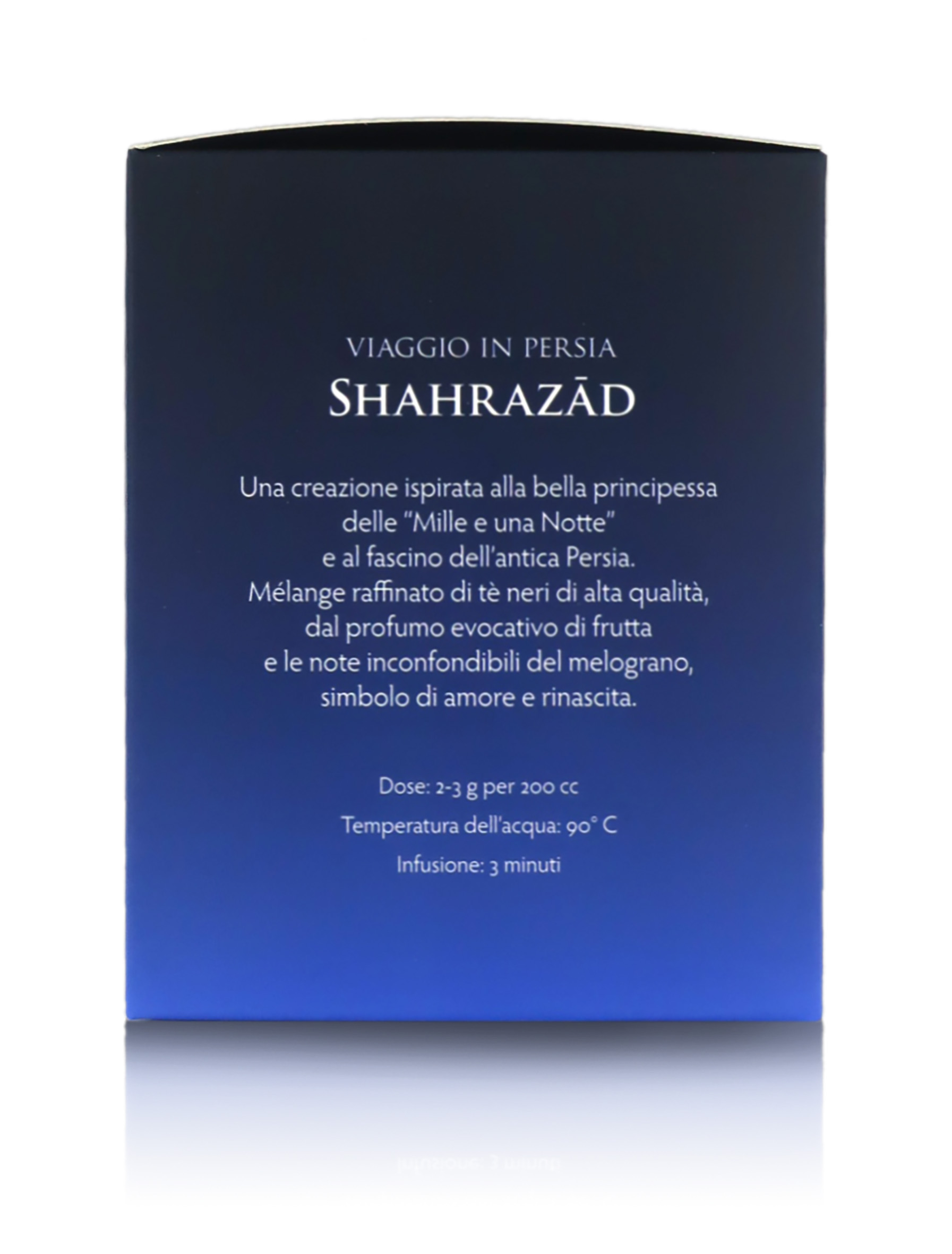 Miscela di tè neri indiani e di Ceylon in foglia, piacevolmente profumata. Si tratta di un mélange raffinato di tè neri di alta qualità, ispirato alla bella principessa delle “Mille e una Notte” e al fascino dell’Antica Persia, dal profumo evocativo di frutta matura, accompagnato da note marcate che ricordano il melograno, simbolo di amore e rinascita.