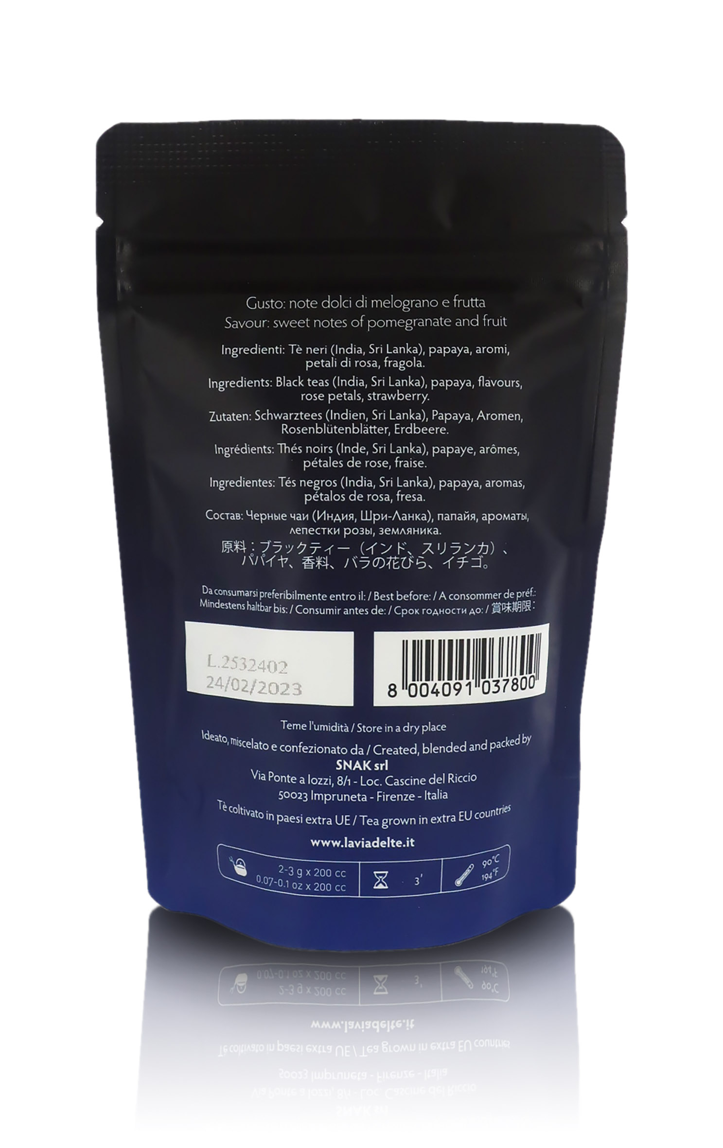 Ingredienti: Tè neri (India, Sri Lanka), papaia, aromi, rosa in petali, fragola.