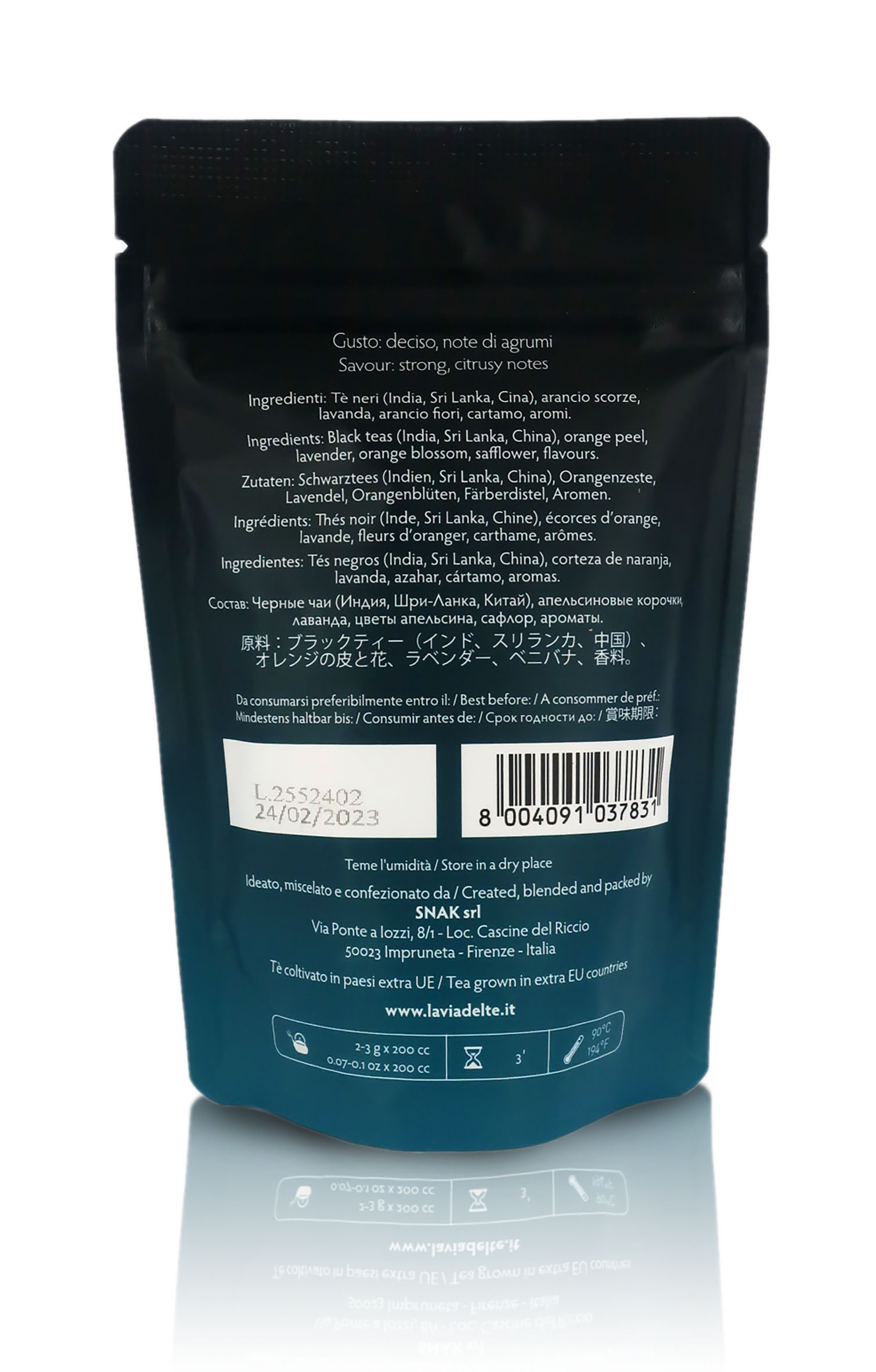 Ingredienti: Tè neri (Cina, Sri Lanka, India), scorza d'arancio, lavanda, fiori d'arancio, petali di cartamo, aromi.