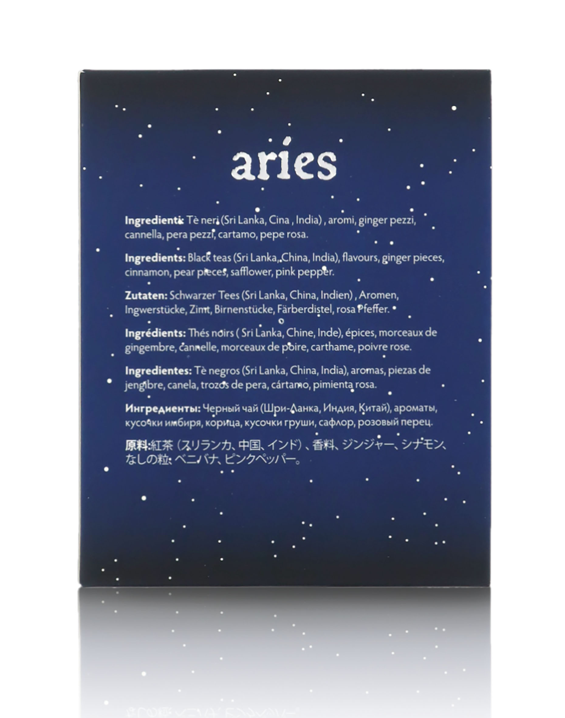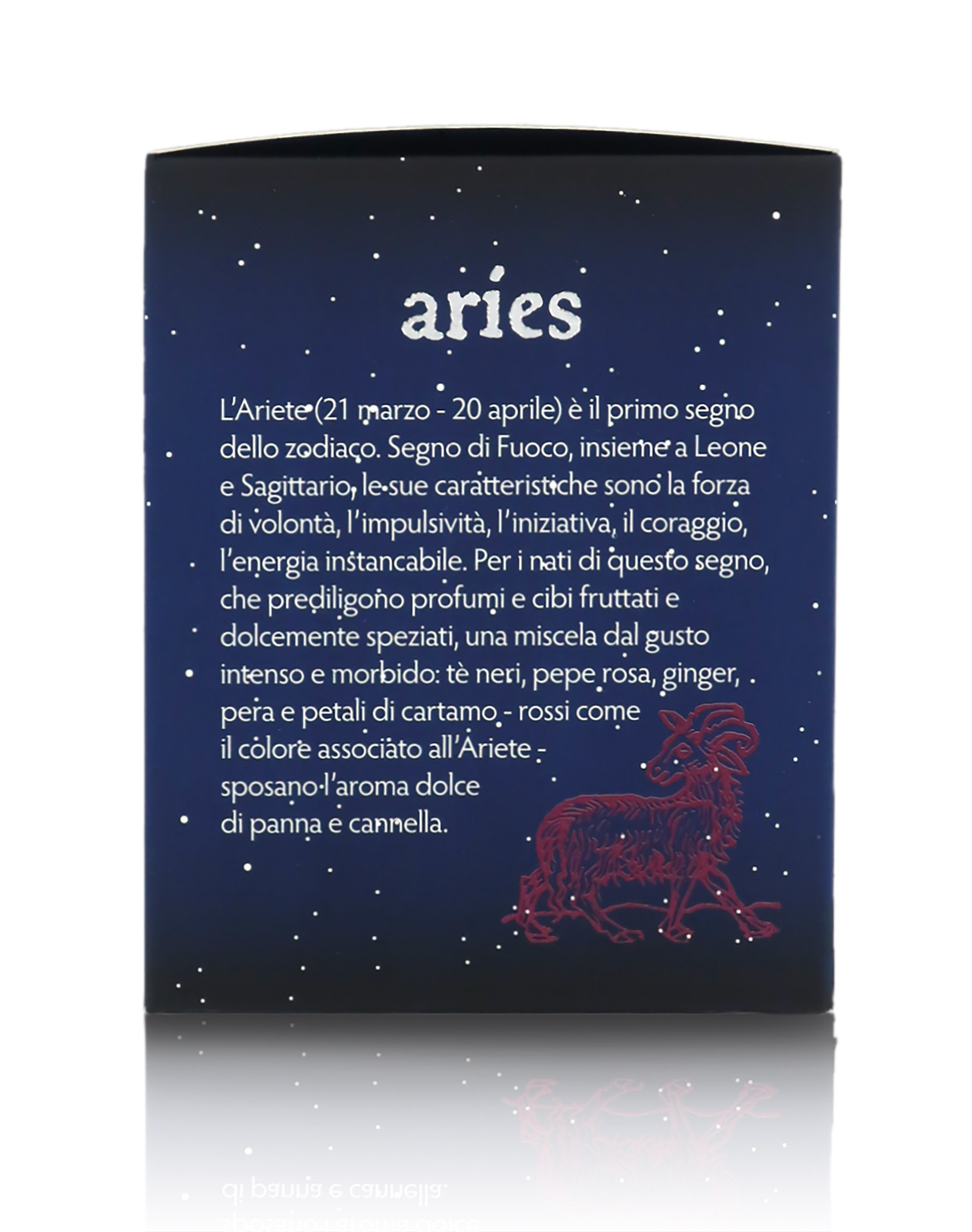 Miscela sfusa di tè neri, piacevolmente profumata, dedicata al segno dell'Ariete. L'Ariete (21 marzo – 20 aprile) è un segno di fuoco, (come il Leone e il Sagittario). Si distingue per forza di volontà, impulsività e coraggio. Per gli Ariete, La Via del Tè ha creato questa miscela dal gusto intenso e morbido, realizzata con tè neri di Ceylon e dell'India, piacevolmente aromatizzati con pepe rosa, zenzero, pera e petali di cartamo. Il colore di quest'ultimo particolarissimo ingrediente (rosso) è anche il colore-simbolo del segno dell'Ariete.