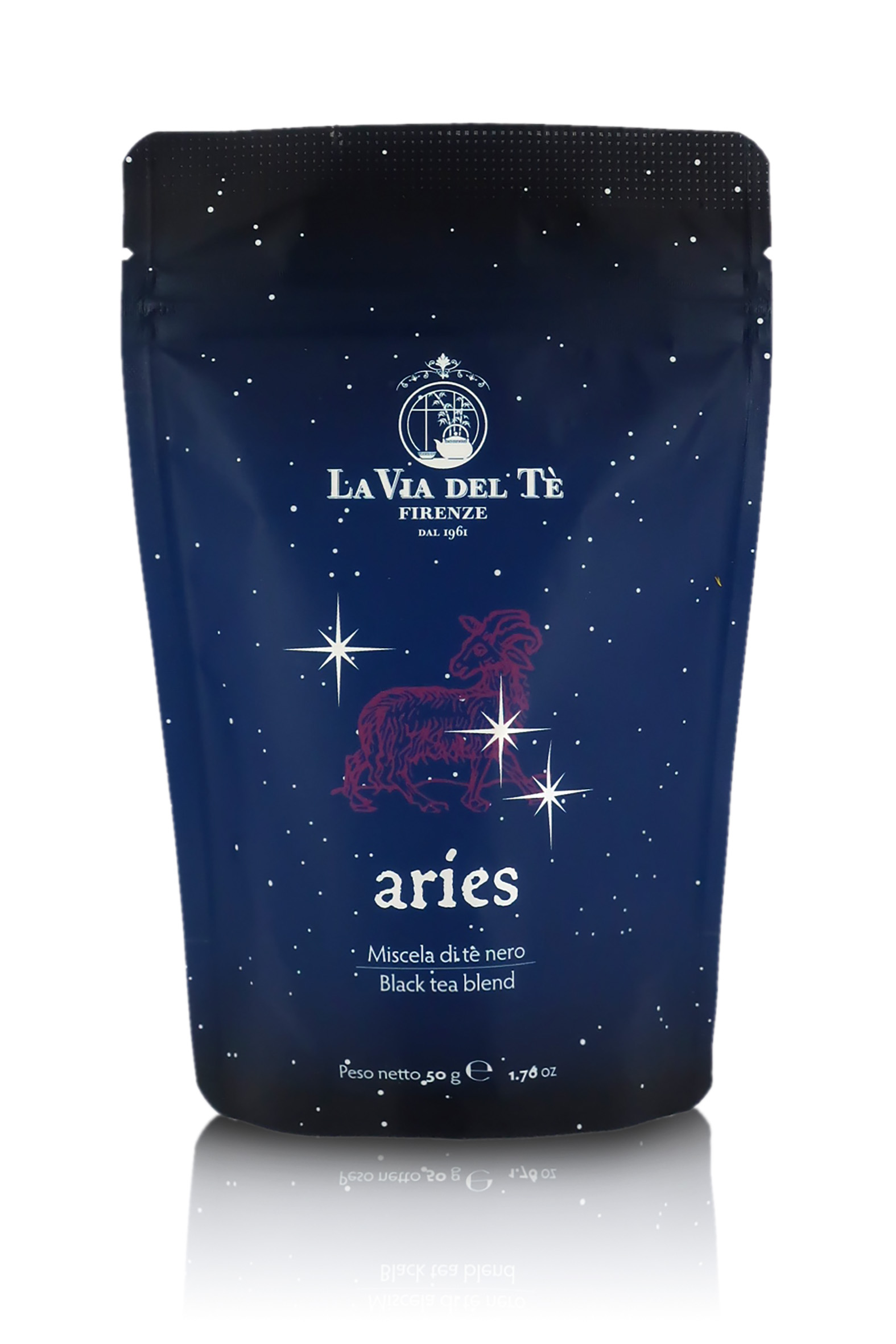 Miscela sfusa di tè neri, piacevolmente profumata, dedicata al segno dell'Ariete. L'Ariete (21 marzo – 20 aprile) è un segno di fuoco, (come il Leone e il Sagittario). Si distingue per forza di volontà, impulsività e coraggio. Per gli Ariete, La Via del Tè ha creato questa miscela dal gusto intenso e morbido, realizzata con tè neri di Ceylon e dell'India, piacevolmente aromatizzati con pepe rosa, zenzero, pera e petali di cartamo. Il colore di quest'ultimo particolarissimo ingrediente (rosso) è anche il colore-simbolo del segno dell'Ariete.
