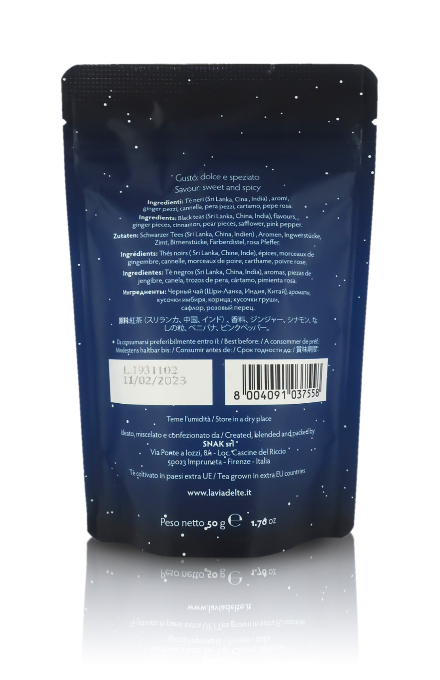 In pratico sacchetto richiudibile da 50g, dotato di comodissima chiusura a striscia.