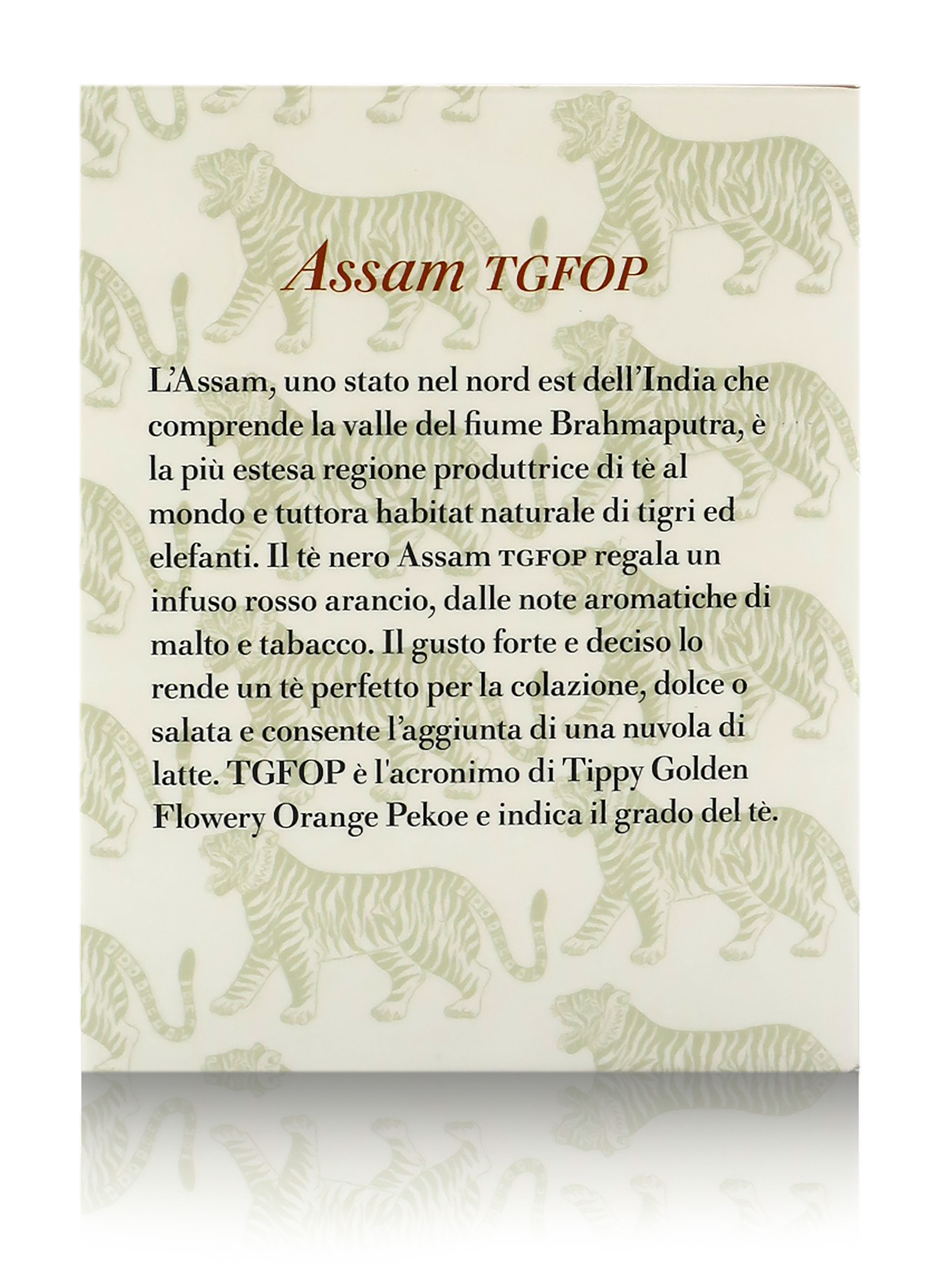 Questo tè nero indiano ha origine nella regione da cui prende il nome, che ospita la valle del fiume Brahmaputra, tigri ed elefanti. Il tè nero Assam TGFOP regala un infuso rosso arancio, ricco di note aromatiche che ricordano il malto e il tabacco. Il suo gusto deciso lo rende un tè perfetto per la colazione, dolce o salata che sia, e consente l’aggiunta di uno spruzzo di latte. TGFOP è l’acronimo di Tippy Golden Flowery Orange Pekoe e indica la sua composizione e, di conseguenza, il grado qualitativo/pregio del tè.