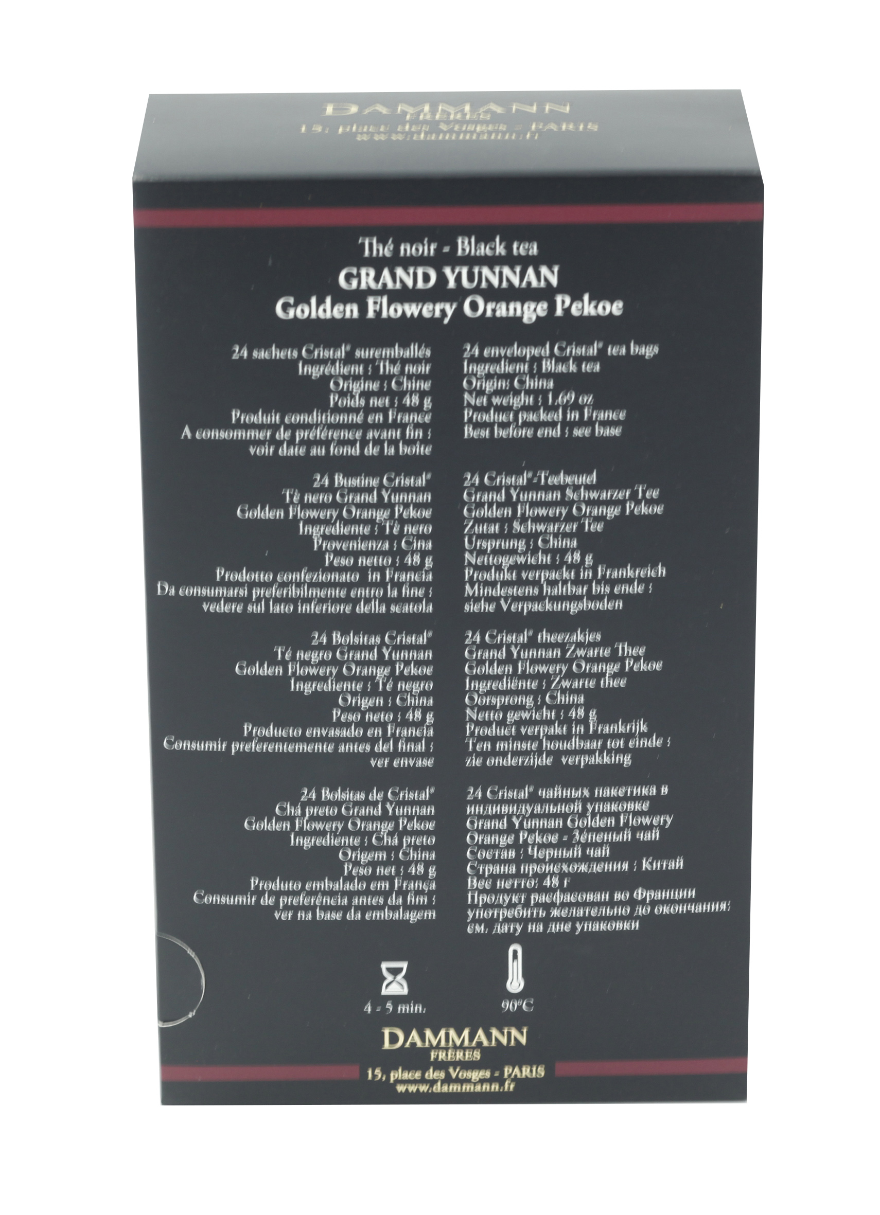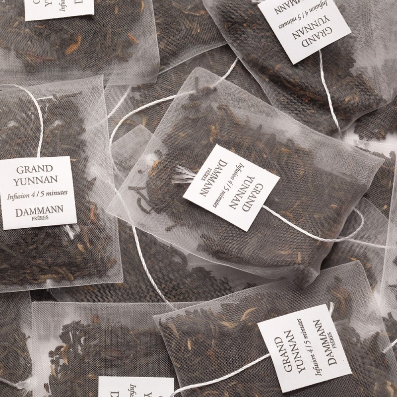 Questo tè nero Grand Yunnan Dammann Frerès è contenuto nelle esclusive e pratiche bustine "Cristal" incartate singolarmente.