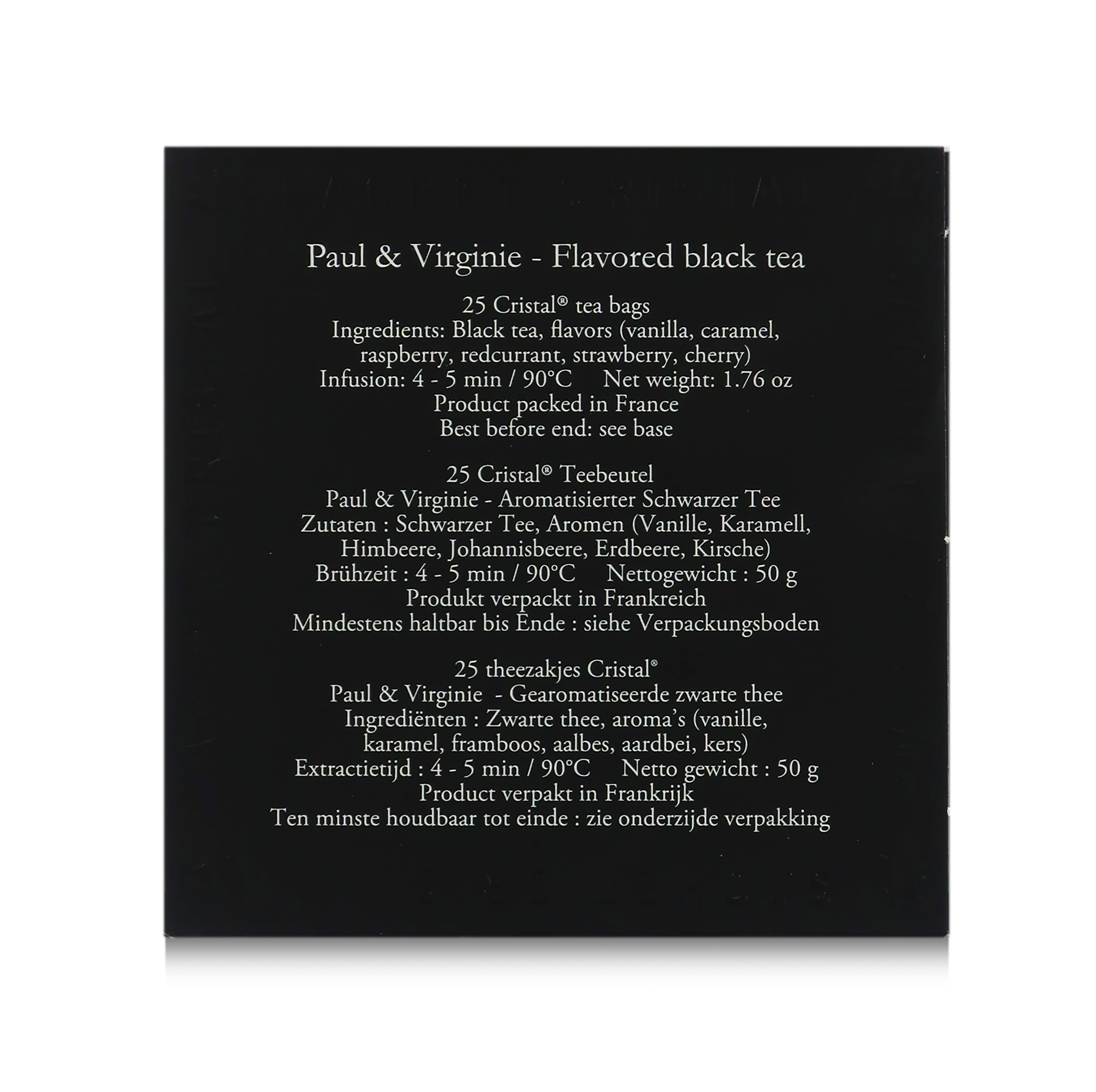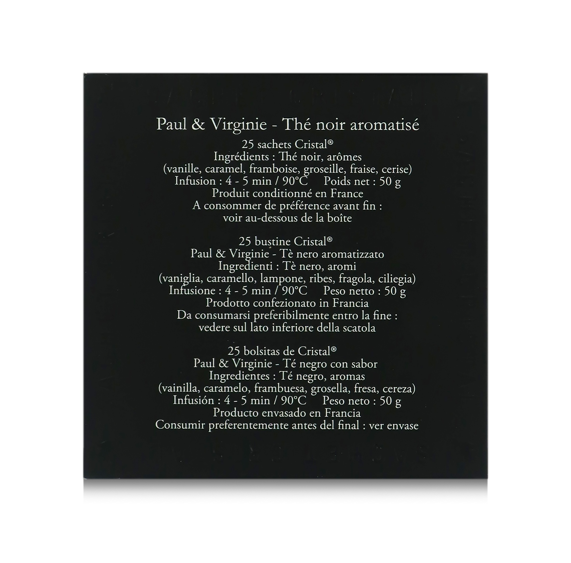 Deliziosamente fruttato, "Paul & Virginie" è un tè nero che vanta una nota dominante di frutti rossi, con sapore principale di ciliegia. Gusti secondari includono fragola, lampone, caramello e vaniglia.