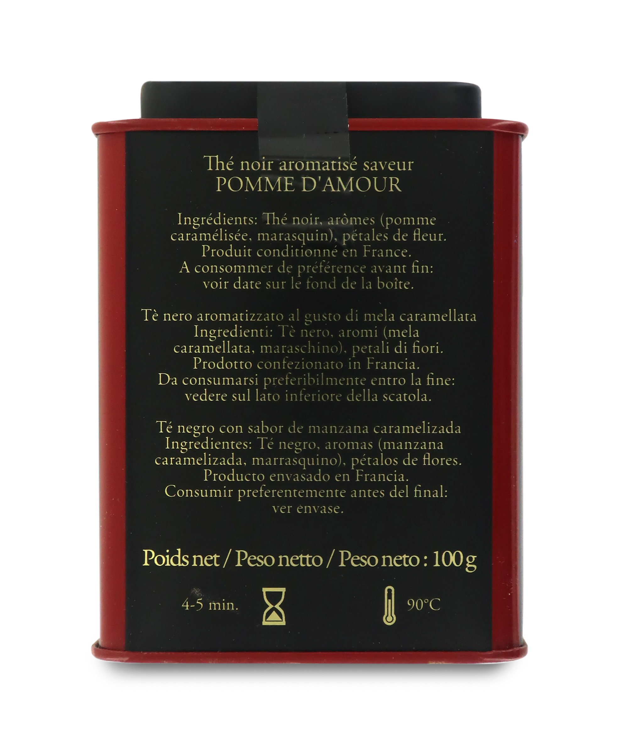 Il tè nero Pomme d'Amour è contenuto in un'elegantissima scatola di latta, perfetta non solo per conservare il prezioso aroma di questo tè pregiato, ma anche da regalare.