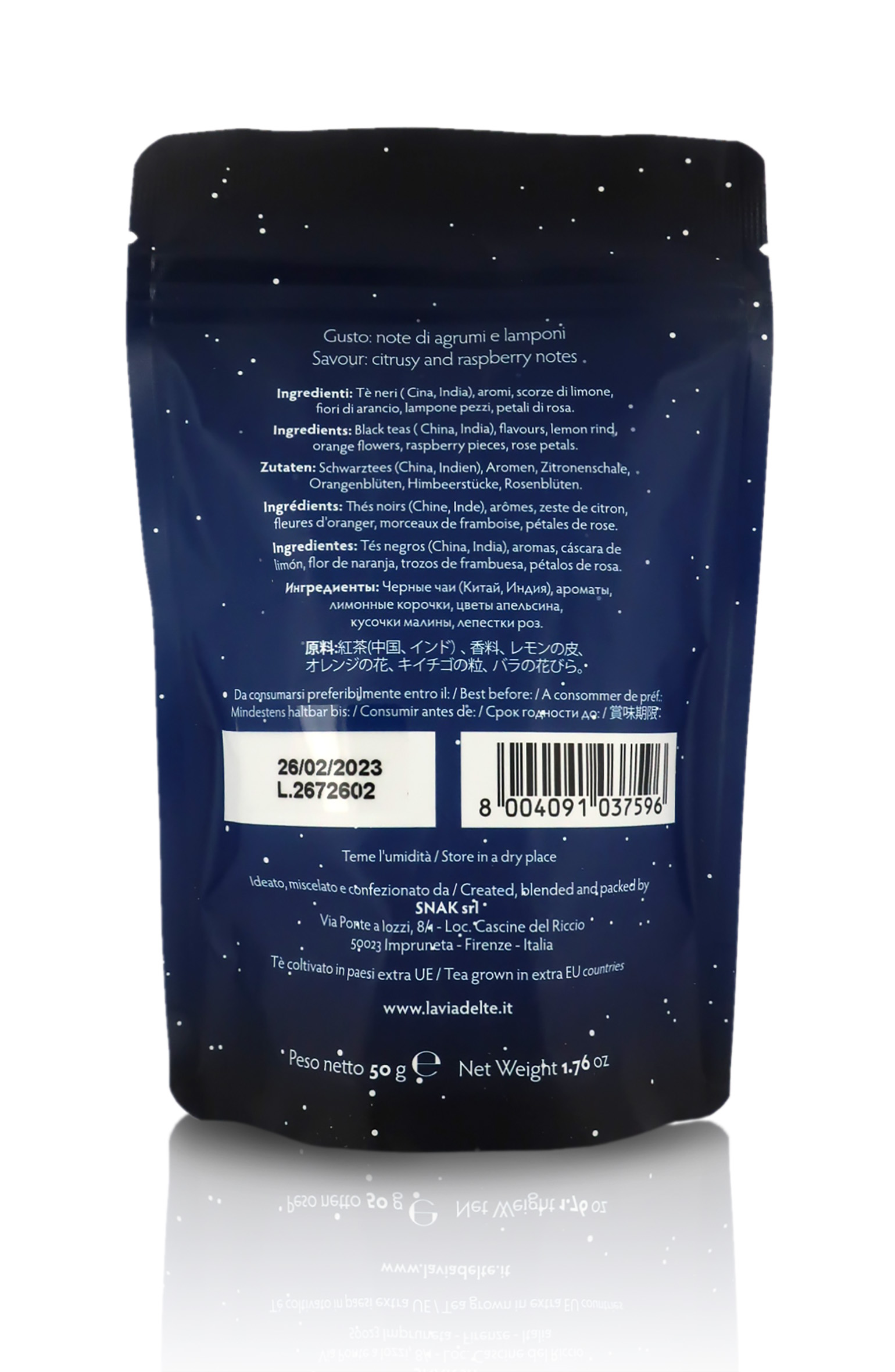 Ingredienti: Tè neri cinesi, tè nero, aromi, scorze di limone, fiori d'arancio, pezzi di lampone, petali di rosa.