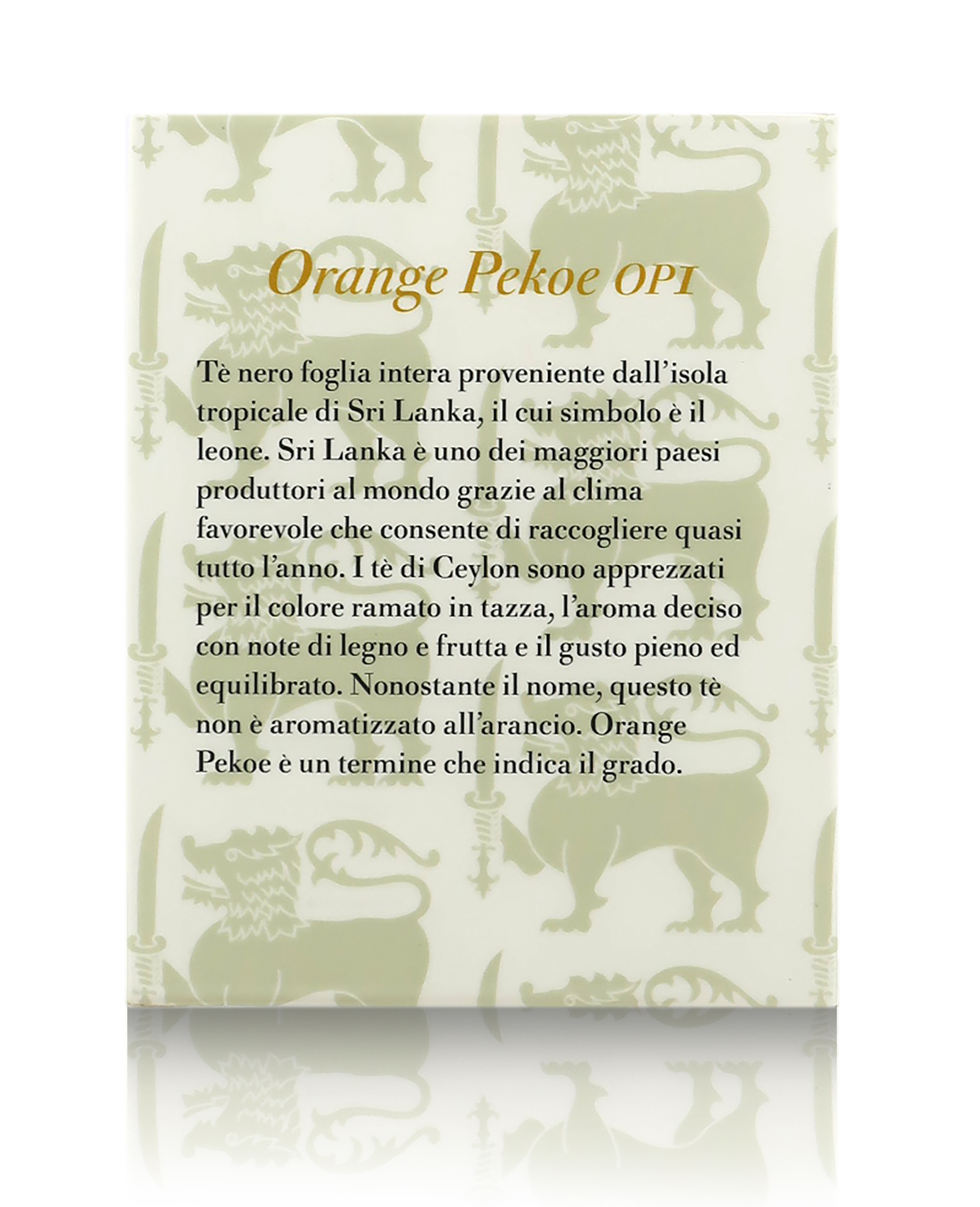 I tè di Ceylon (Sri Lanka) sono apprezzati per il colore ramato in tazza, l'aroma deciso (caratterizzato da note di legno e frutta) e il gusto pieno ed equilibrato. Il nome non indica il gusto del tè, bensì segnala il prestigio/grado di qualità del tè. Infatti, nonostante il nome possa far sembrare altrimenti, questo tè non è aromatizzato all'arancio.