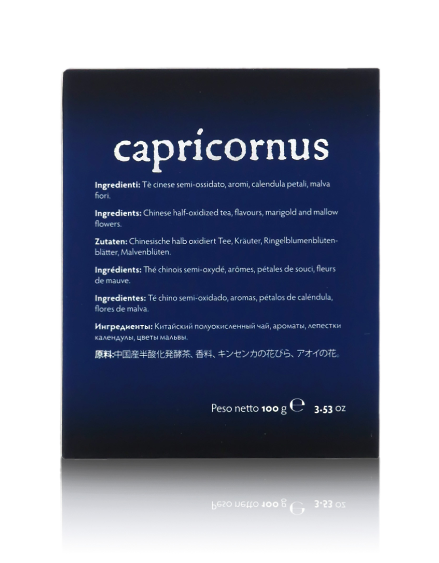 Miscela sfusa di tè semi-ossidato Oolong, piacevolmente profumata, dedicata al segno del Capricorno. I nati sotto il segno del Capricorno (22 Dicembre-20 Gennaio), governati dagli influssi del Pianeta Saturno, si distinguono per lealtà e pazienza. Di carattere introspettivo, preferiscono la riservatezza alle estroversione.
