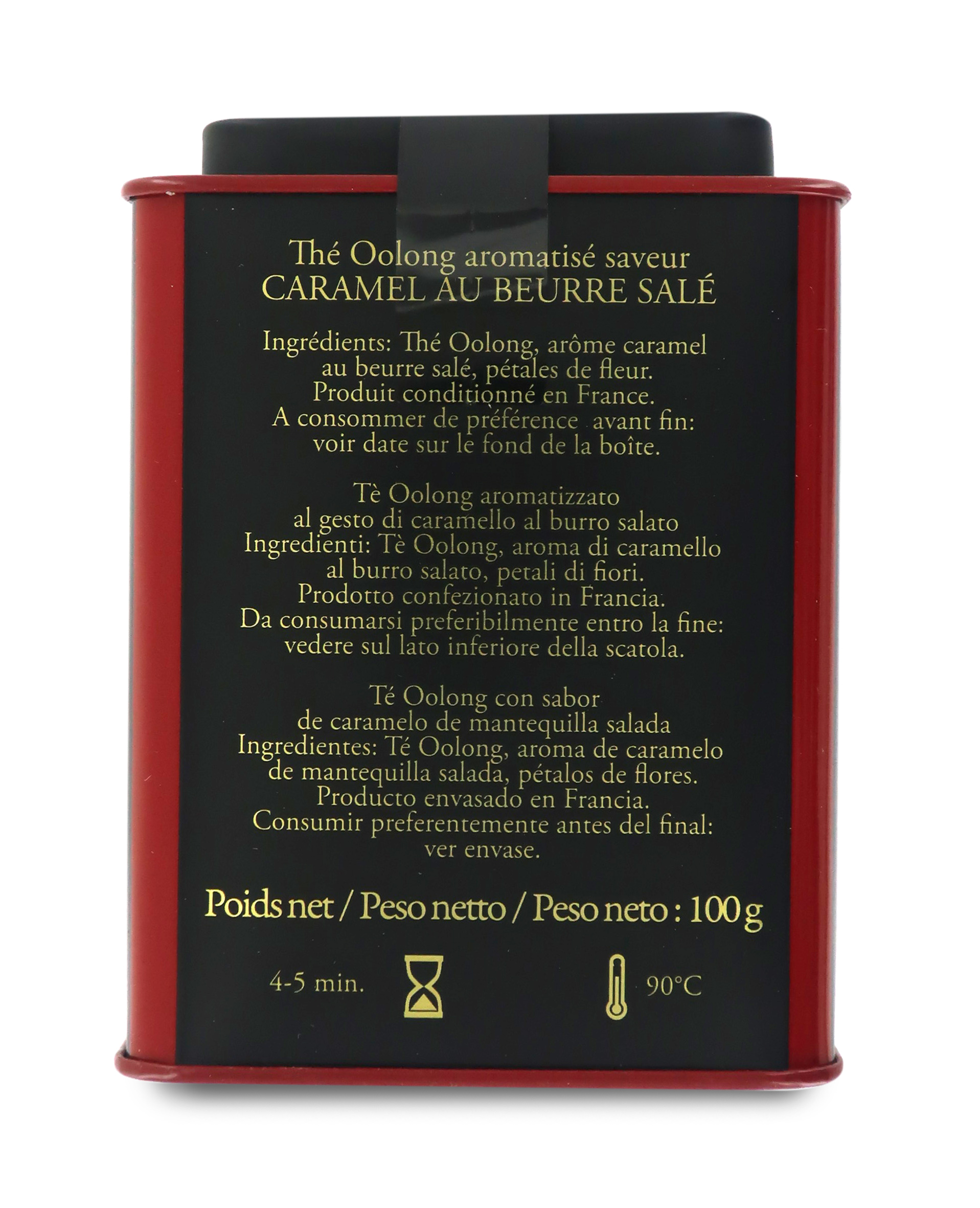 Il tè oolong "Caramel au Beurre Salé" è un tè goloso che unisce le note vellutate dell'oolong con l'intenso aroma dolce e, al contempo, salato del caramello. Ottimo alla sera, per cullarsi dopo una giornata stressante. Composizione: tè oolong, petali di fiori e aroma di caramello al burro salato.