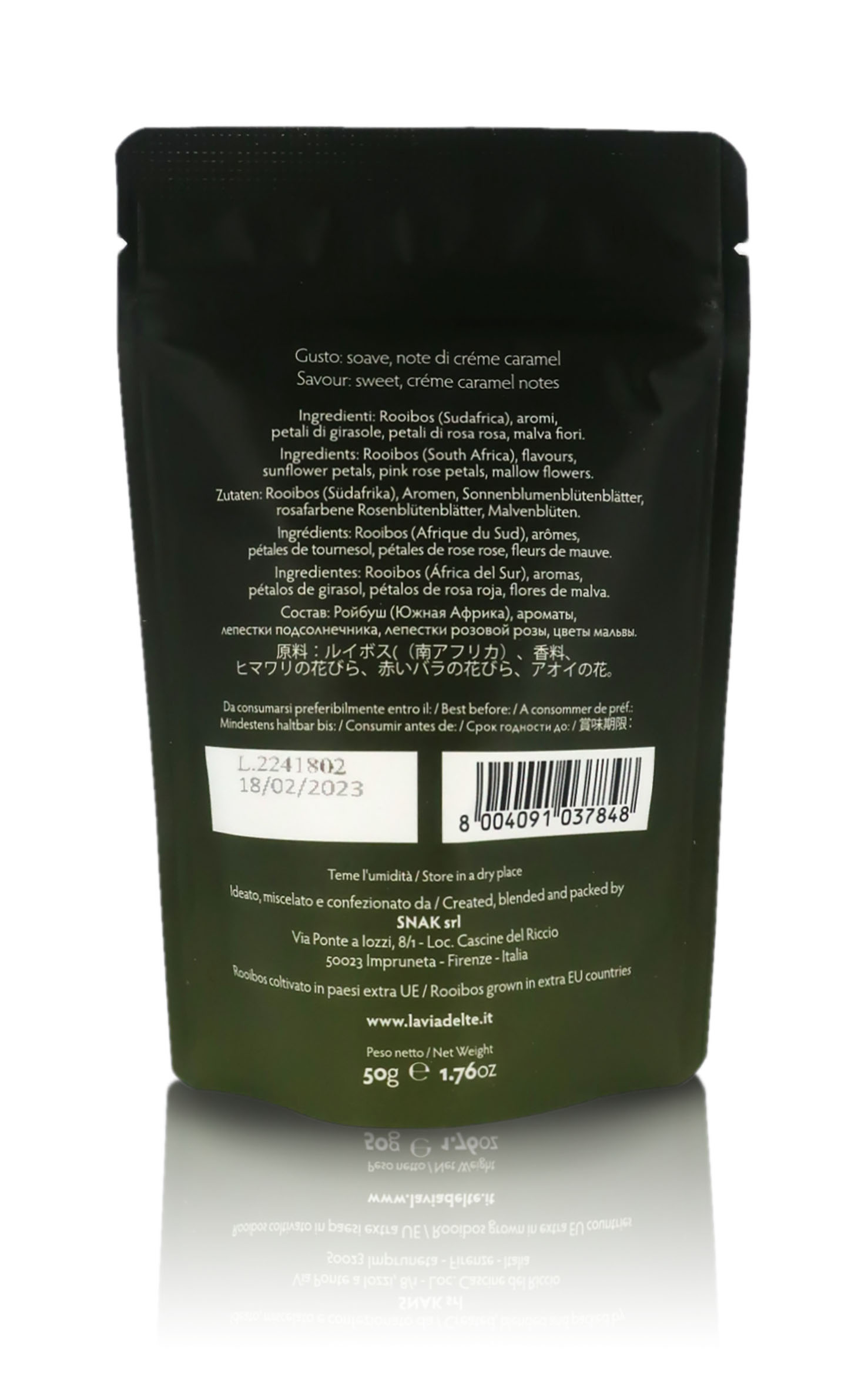 Ingredienti: Rooibos (Sud Africa), aromi, petali di girasole, petali di rosa, fiori di malva.