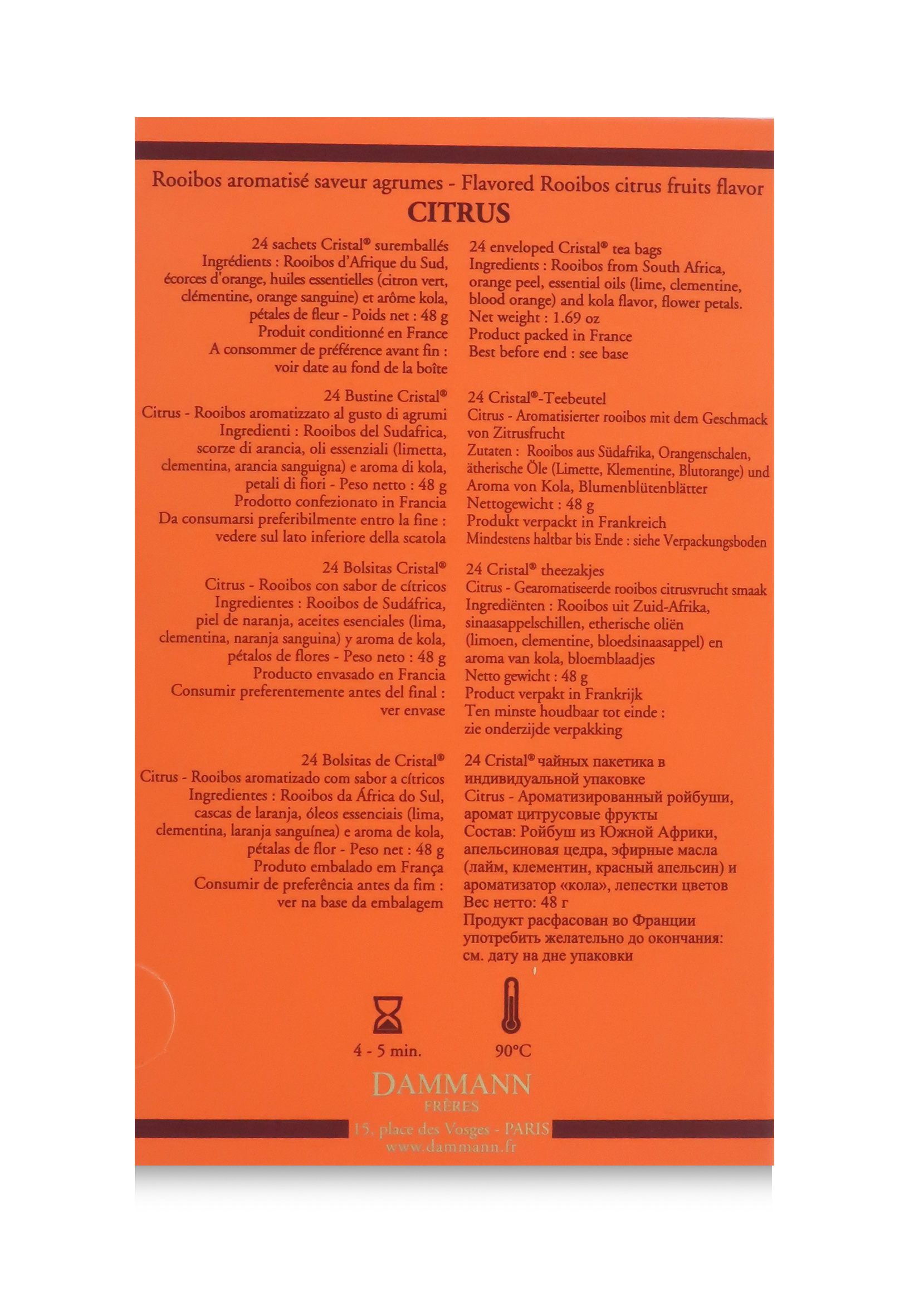 Questo rooibos agli agrumi di Dammann Frères è contenuto in esclusive e pratiche bustine "Cristal" incartate singolarmente.