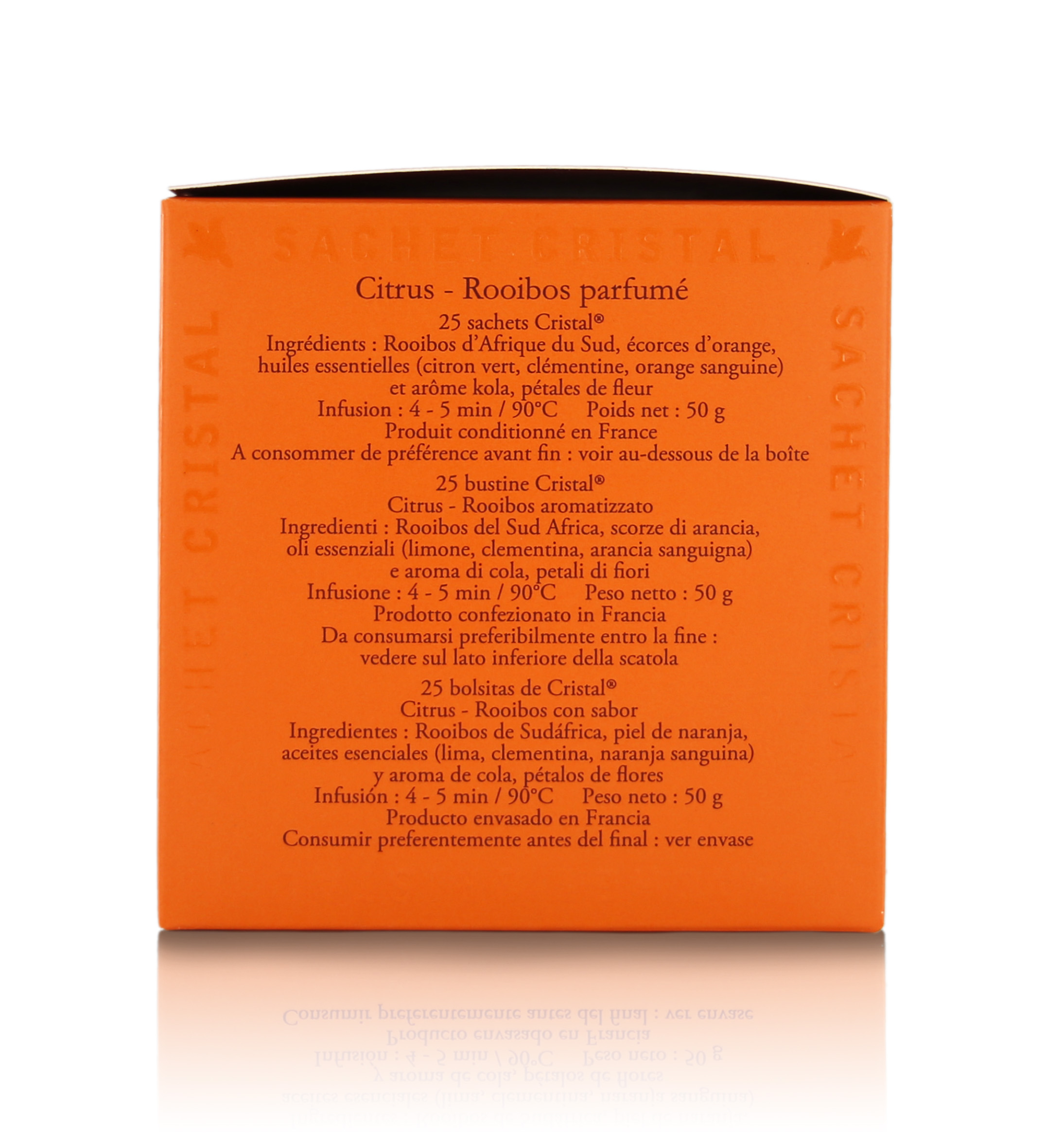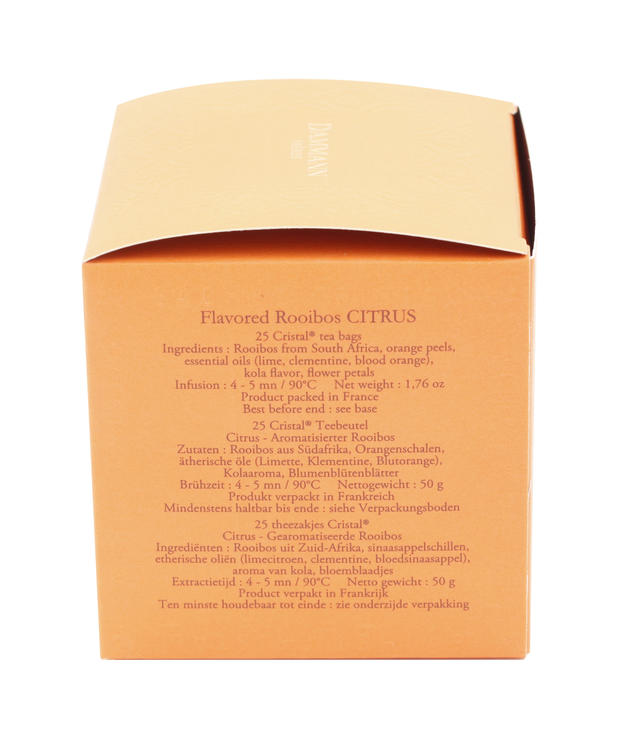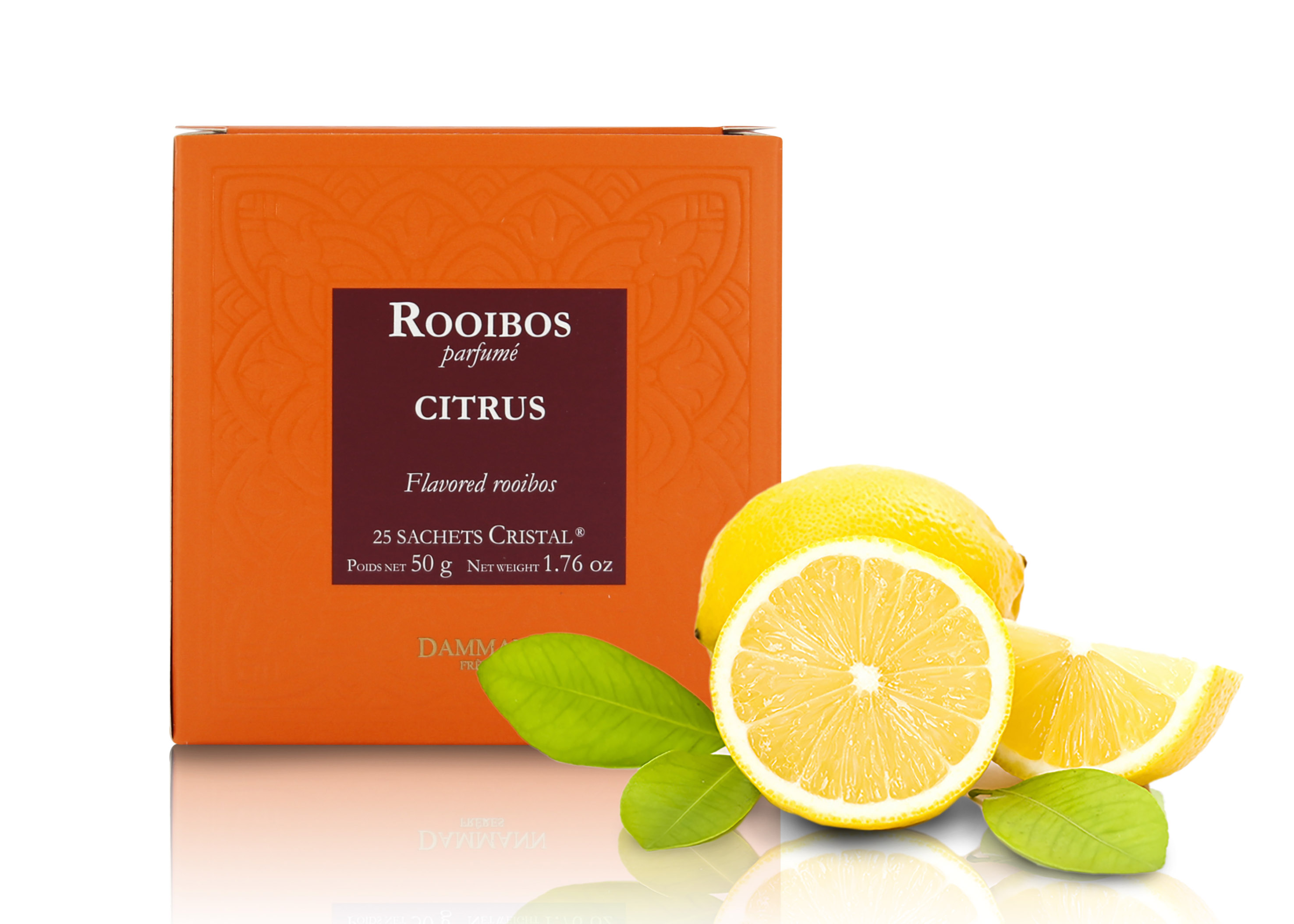 Questo rooibos agli agrumi di Dammann Frères è contenuto in esclusive e pratiche bustine "Cristal".
