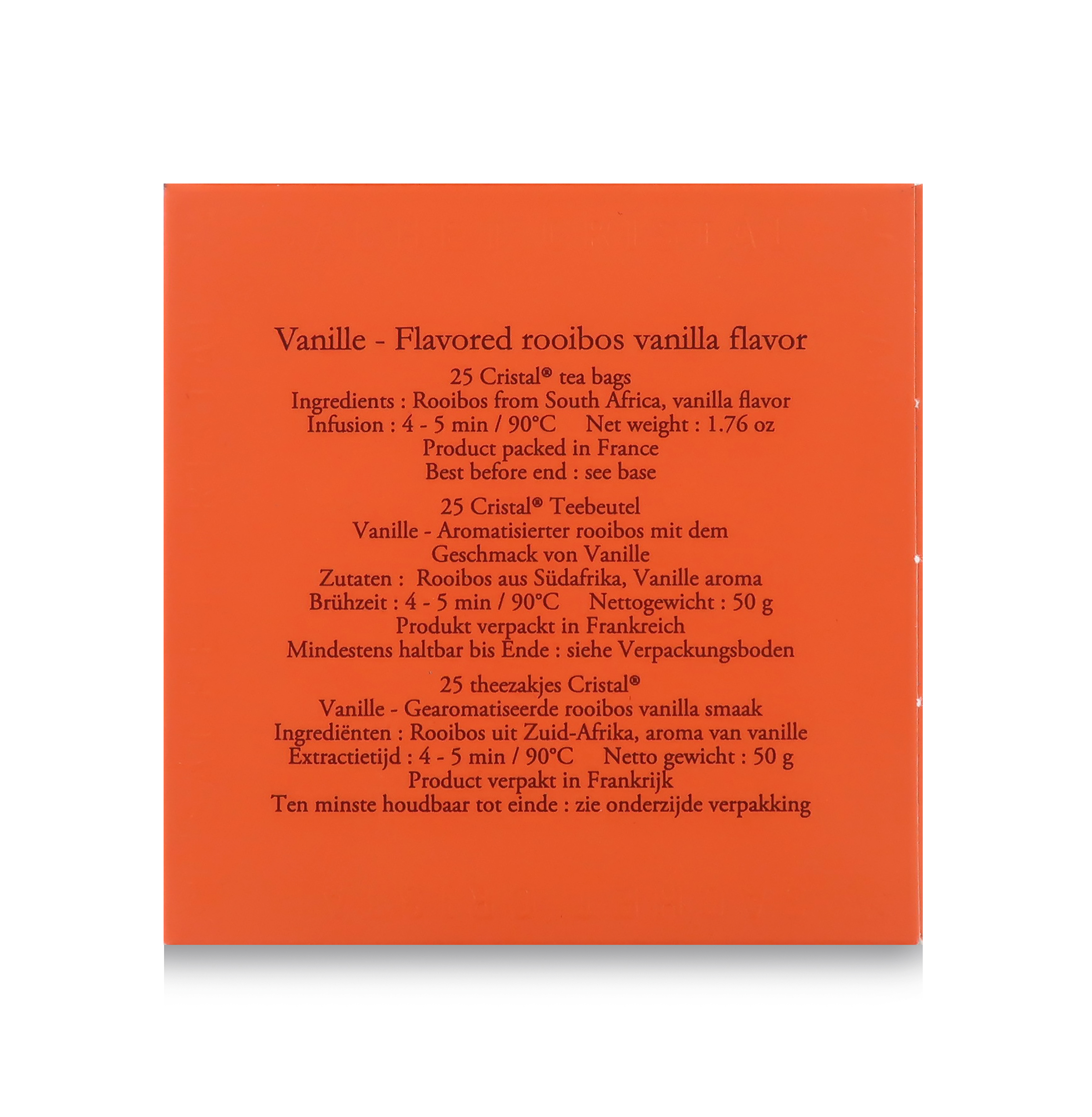 Rooibos aromatizzato con pezzetti di vaniglia. Per una infusione dolce dal sapore intenso, ma piacevolmente bilanciato dalle note morbide del rooibos.