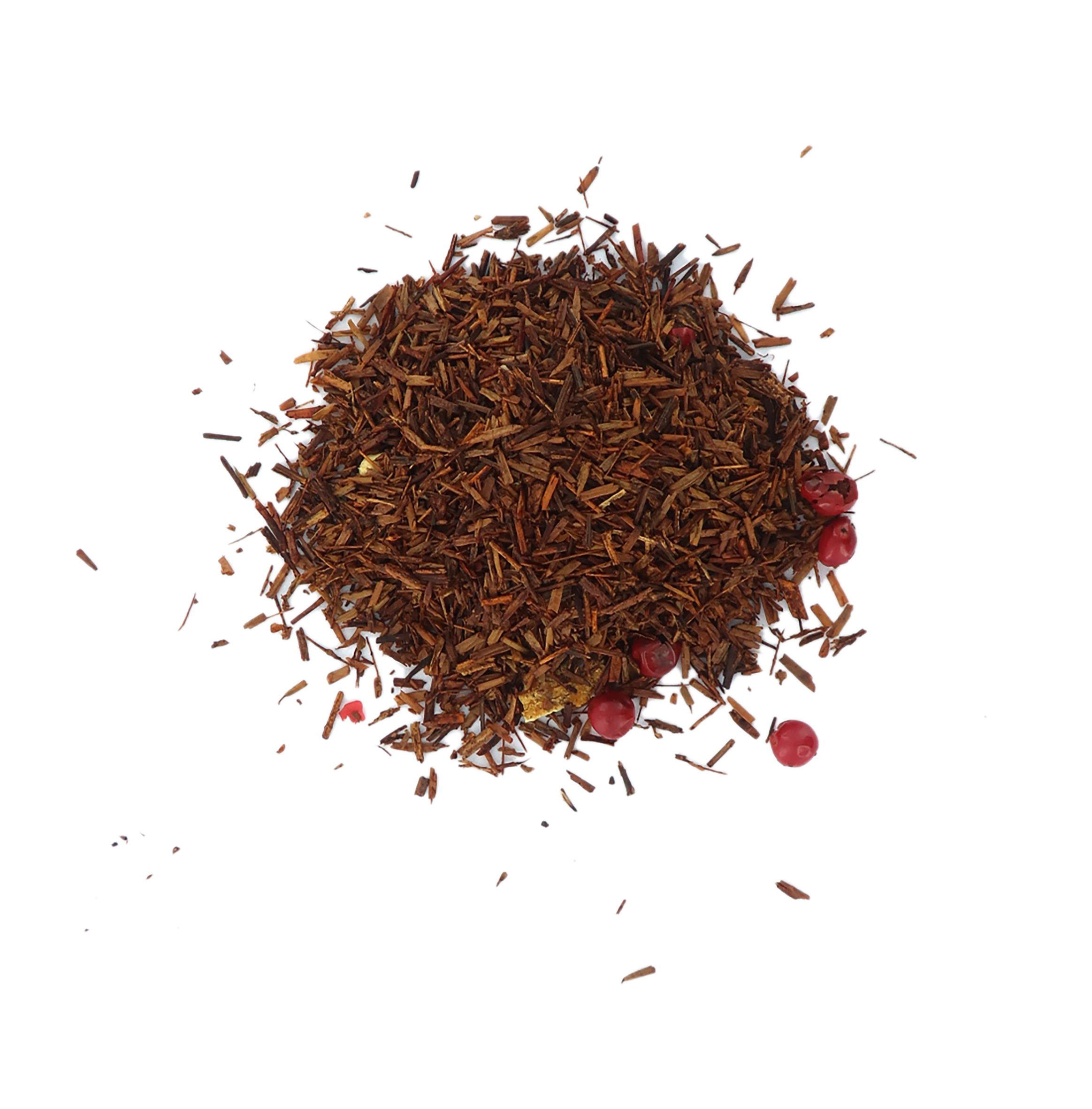 Rooibos di Natale in formato sfuso, contenuto in graziosa latta. Il caratteristico infuso del Sudafrica si arricchisce di profumi prettamente natalizi: scorze d'arancia, aromi di pan di zenzero, arancia amara e ciliegia. A completare il bouquet, una manciata di spezie che fa subito Natale: pepe rosa, zenzero e chiodi di garofano.