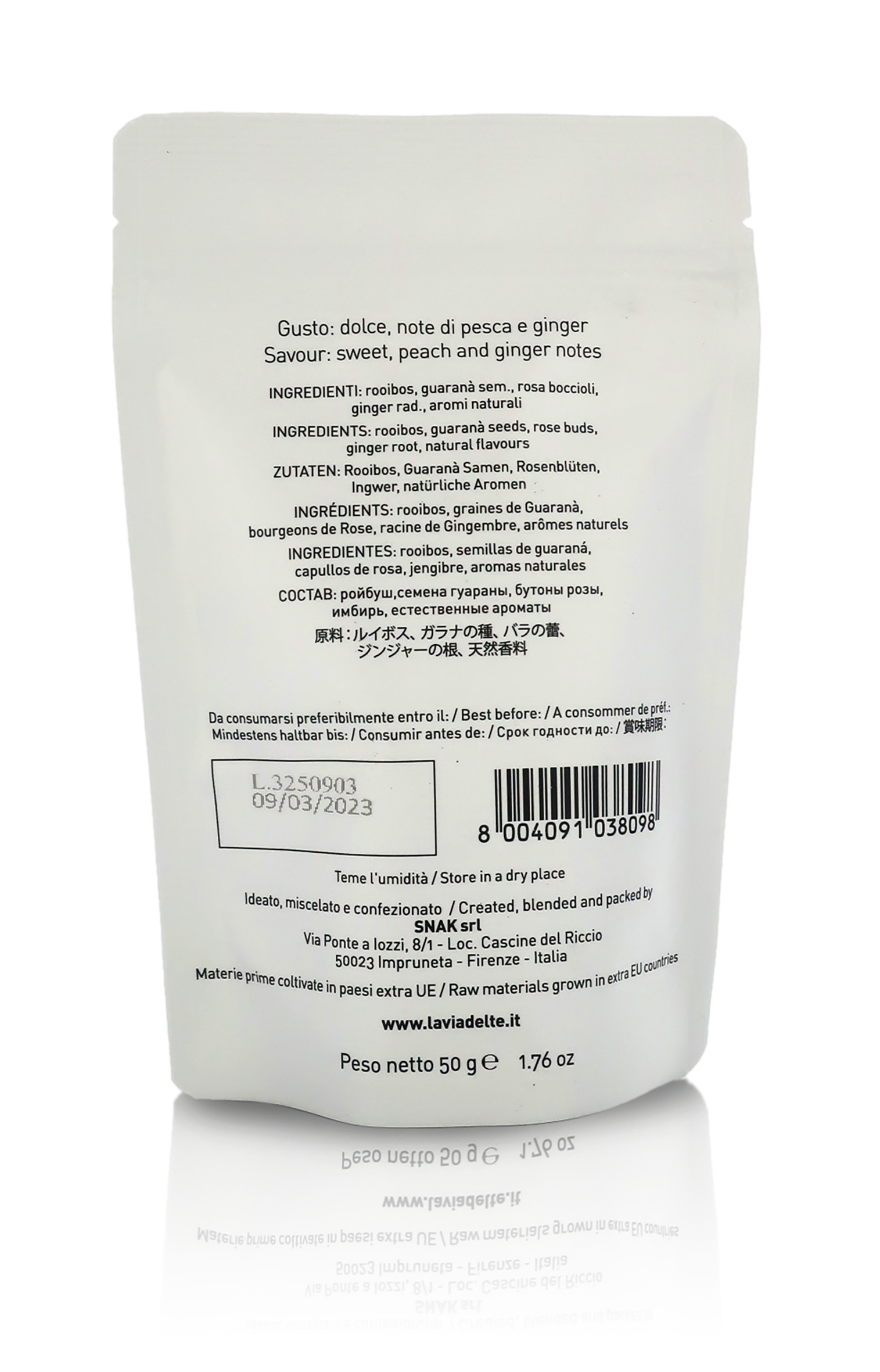 Ingredienti: Rooibos, guaranà, rosa in boccioli, ginger, aromi.