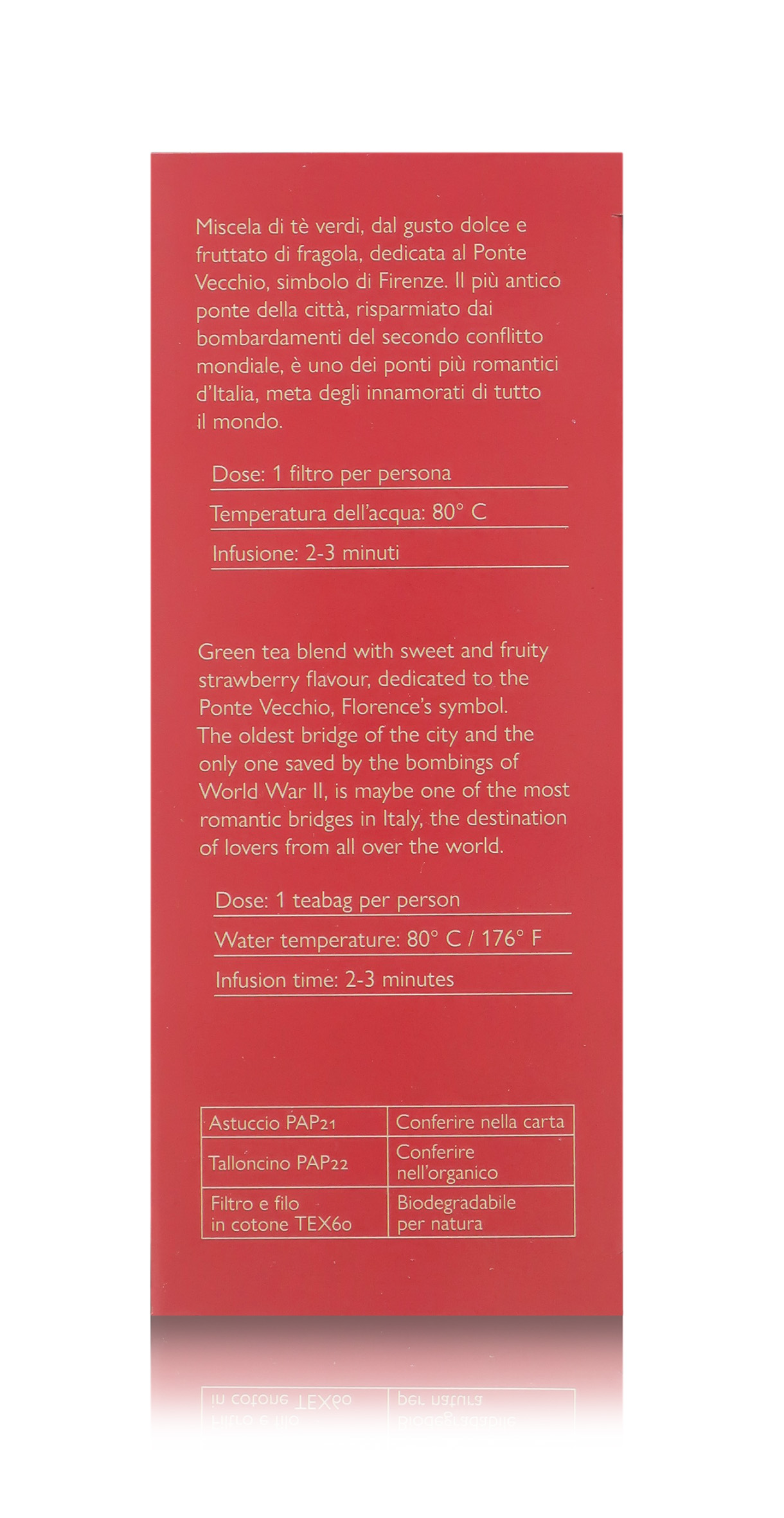 Miscela di tè verdi dedicata al Ponte Vecchio, il simbolo di Firenze. Il più antico ponte della città è uno dei più romantici in Italia, scelto come destinazione dagli innamorati di tutto il mondo. Vanta un gusto dolce e fruttato di fragola.