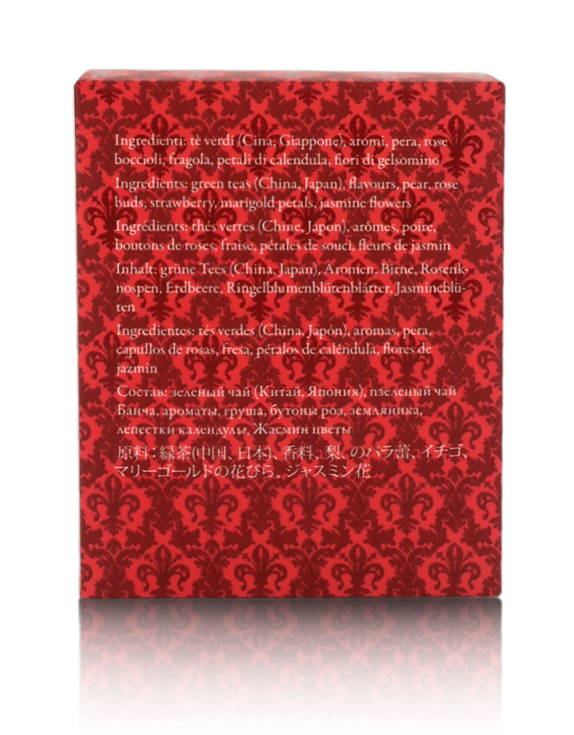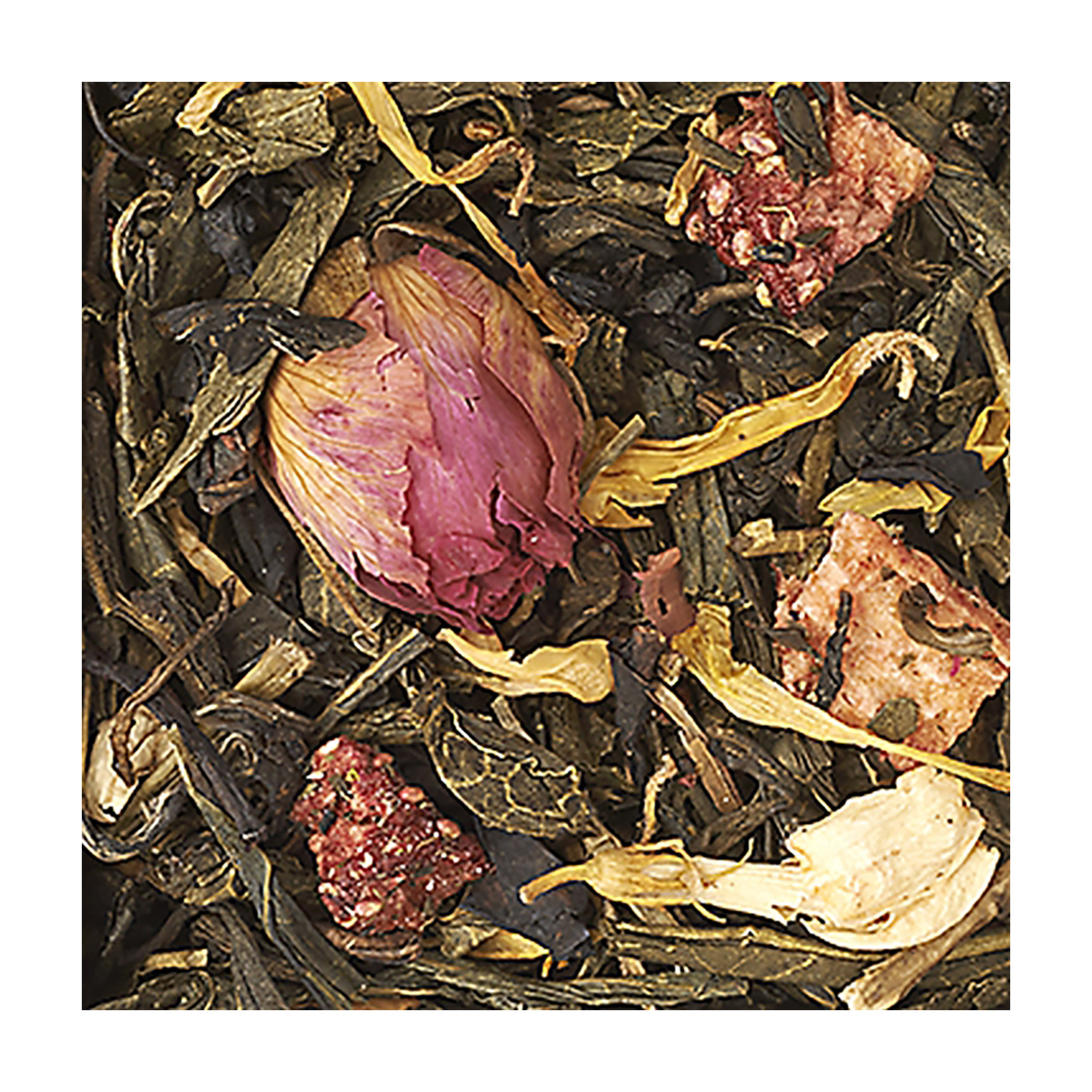 Ingredienti: Tè verde Bancha, tè verdi, aromi, pera, boccioli di rosa, fragola, calendula, fiori di gelsomino.