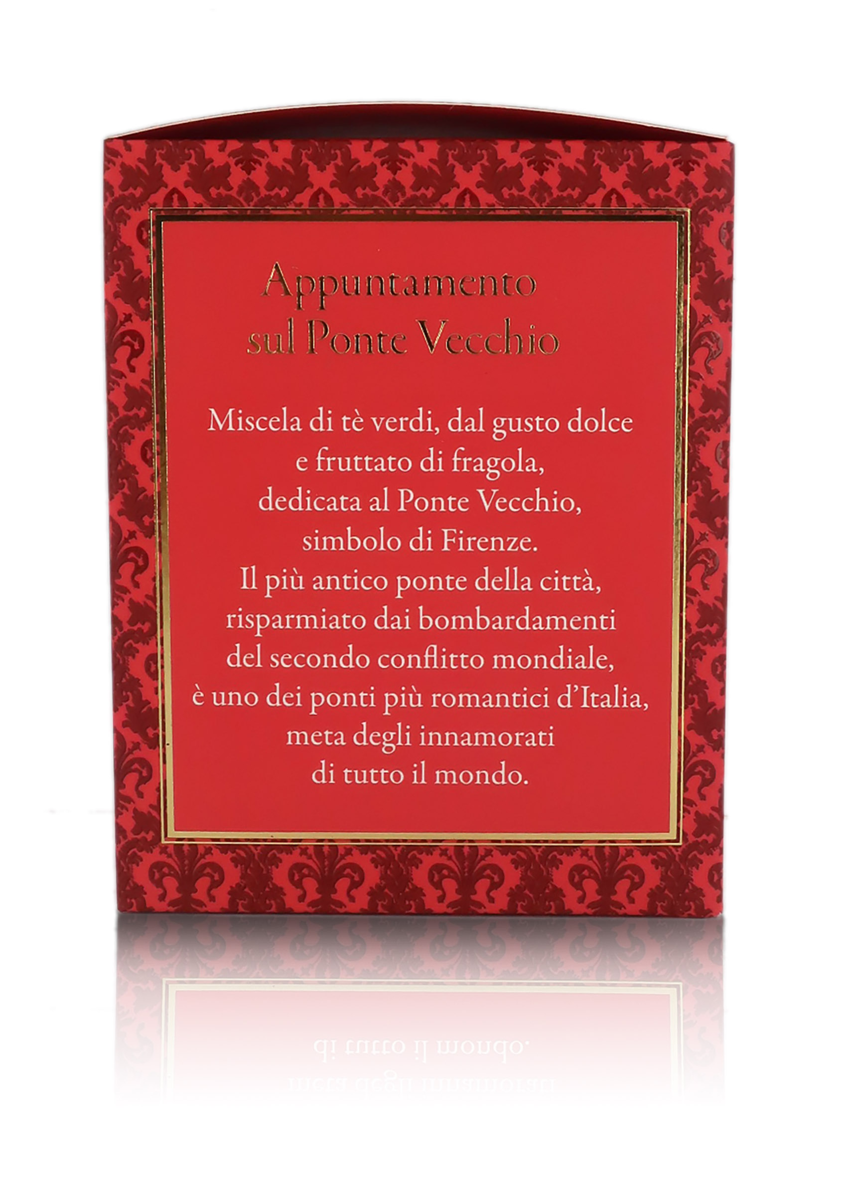 Miscela sfusa di tè verdi in foglia, tra cui Bancha, dedicata al Ponte Vecchio, il simbolo di Firenze. Il più antico ponte della città è uno dei più romantici in Italia, scelto come destinazione dagli innamorati di tutto il mondo. Vanta un gusto dolce e fruttato di fragola.