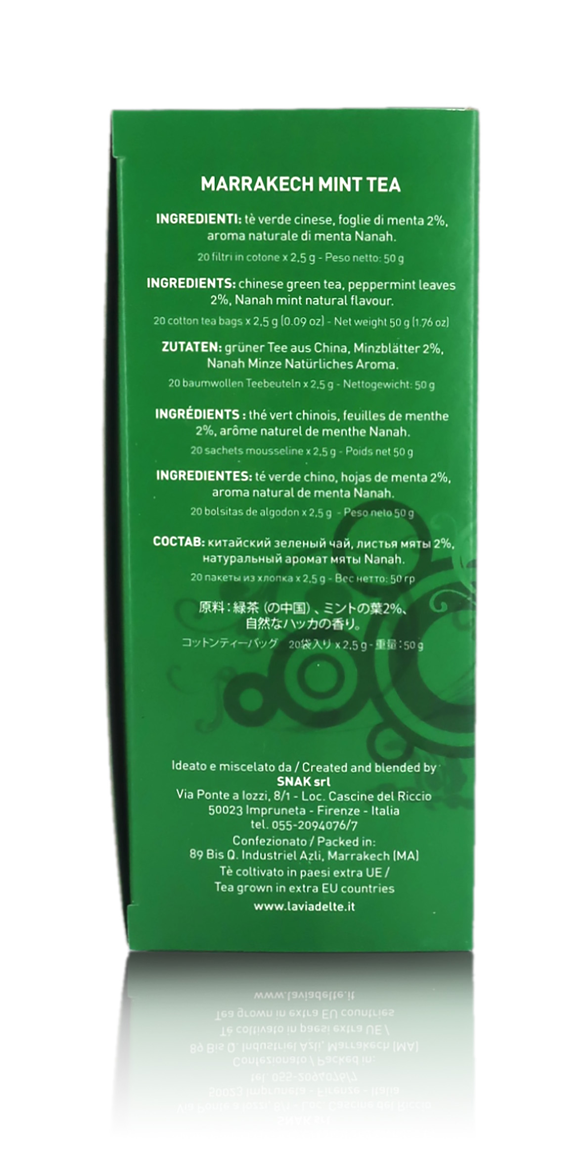 Ingredienti: tè verde cinese Special Gunpowder, menta Viridis in foglie 2%, aroma naturale di menta Nana 1%.