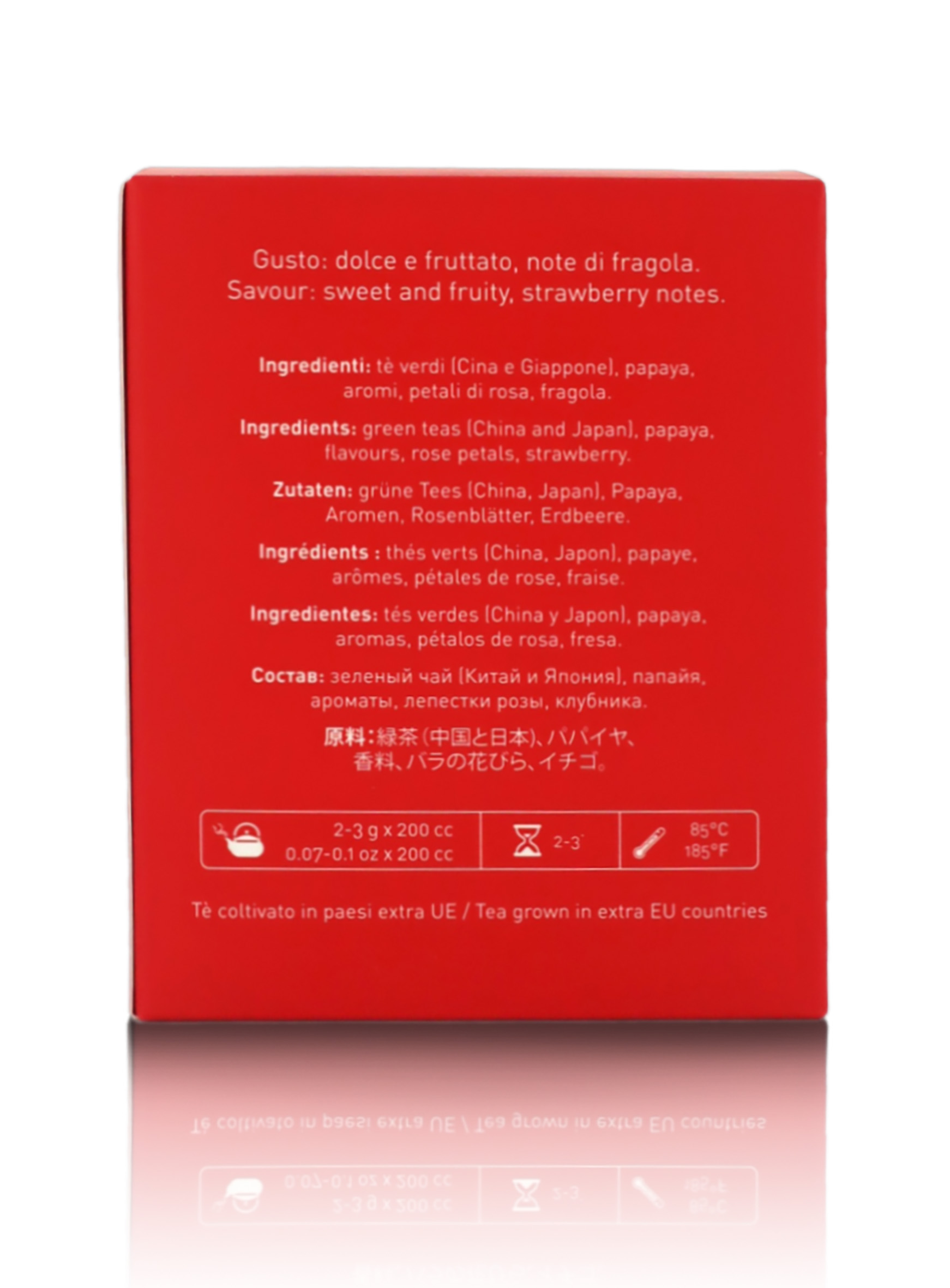 Ingredienti: Tè verdi, papaia, petali di rosa, fragola, aromi, aroma naturale.