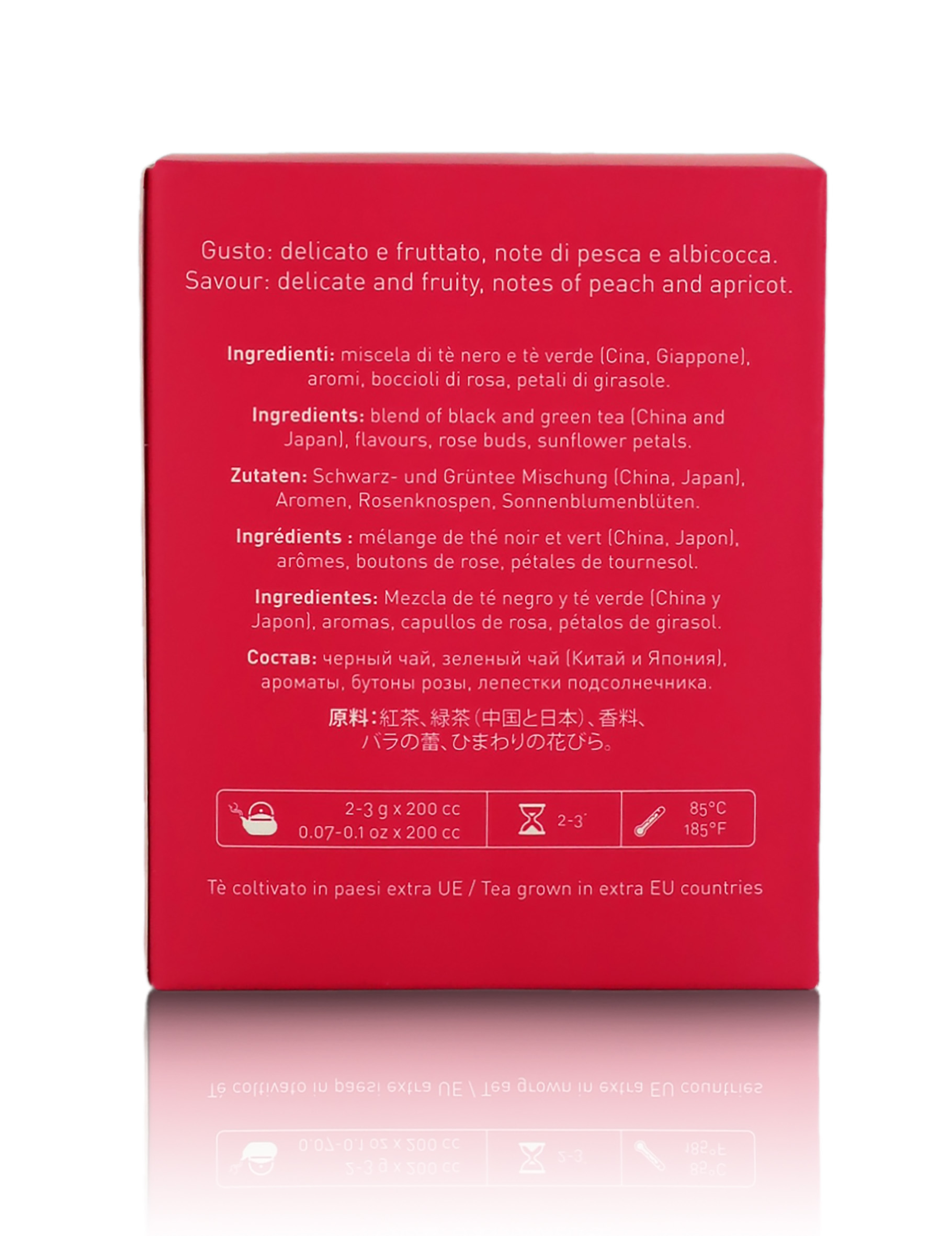 Ingredienti: Tè nero alla rosa, tè verde Bancha, boccioli di rosa, petali di girasole, aromi.