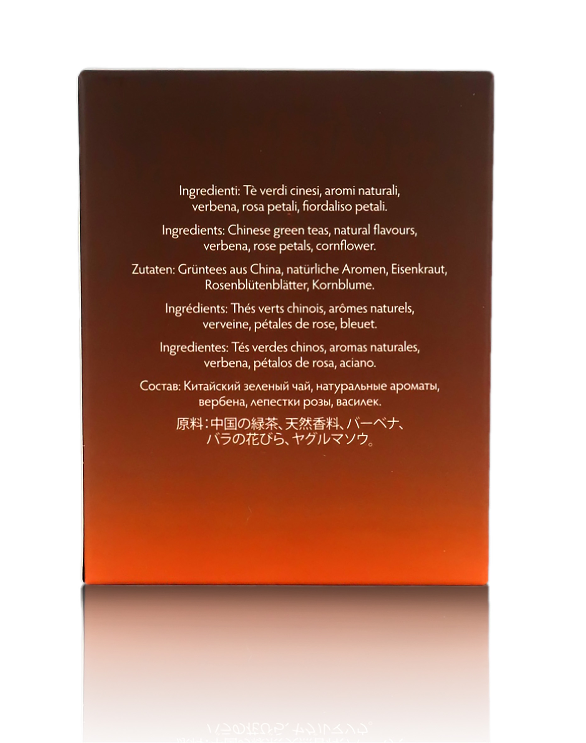 Ingredienti: tè verdi cinesi, aromi naturali, verbena, petali di rosa rossa, fiordaliso.