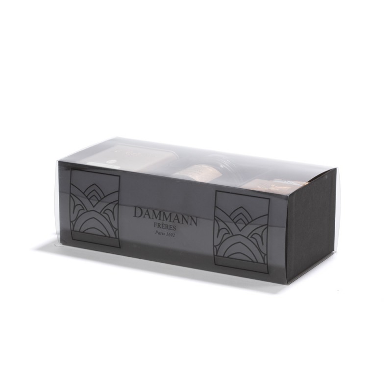 La confezione regalo "Miss Dammann" di Dammann Frères si caratterizza per dare pieno risalto a una delle varietà di tè tra le più famose della maison francese che realizza tè da ormai quasi 4 secoli. Il cofanetto di colore scuro risulta molto elegante e raffinato. Al suo interno custodisce 1 barattolo di latta contenente 100 grammi di tè aromatizzato Miss Dammann, un vasetto di vetro con gelatina di tè (235g), 6 bustine Cristal di tè (incartate singolarmente) e un contenitore da tavolo in cui disporre le bustine.