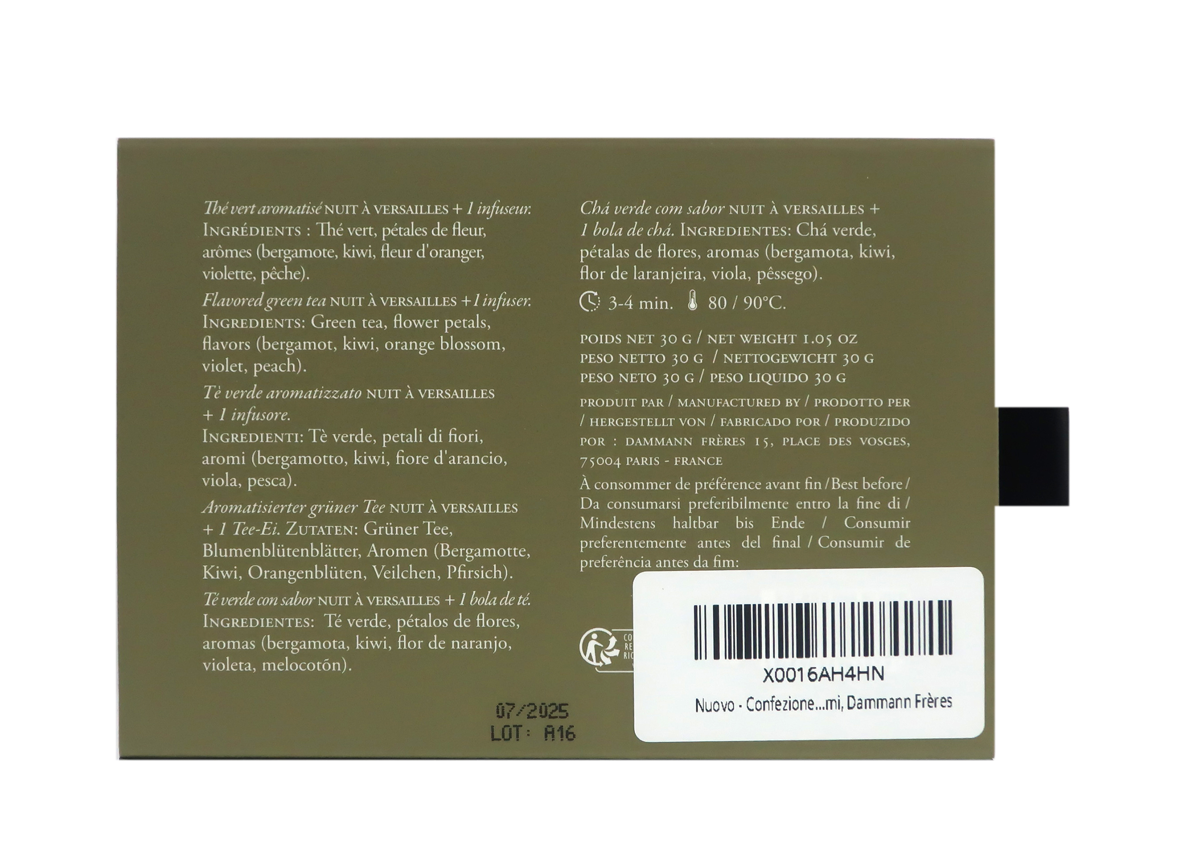 Il famoso Nuit à Versailles è un tè verde aromatizzato con petali di fiori e aromi (bergamotto, kiwi, fiori d'arancio, violetta, pesca).