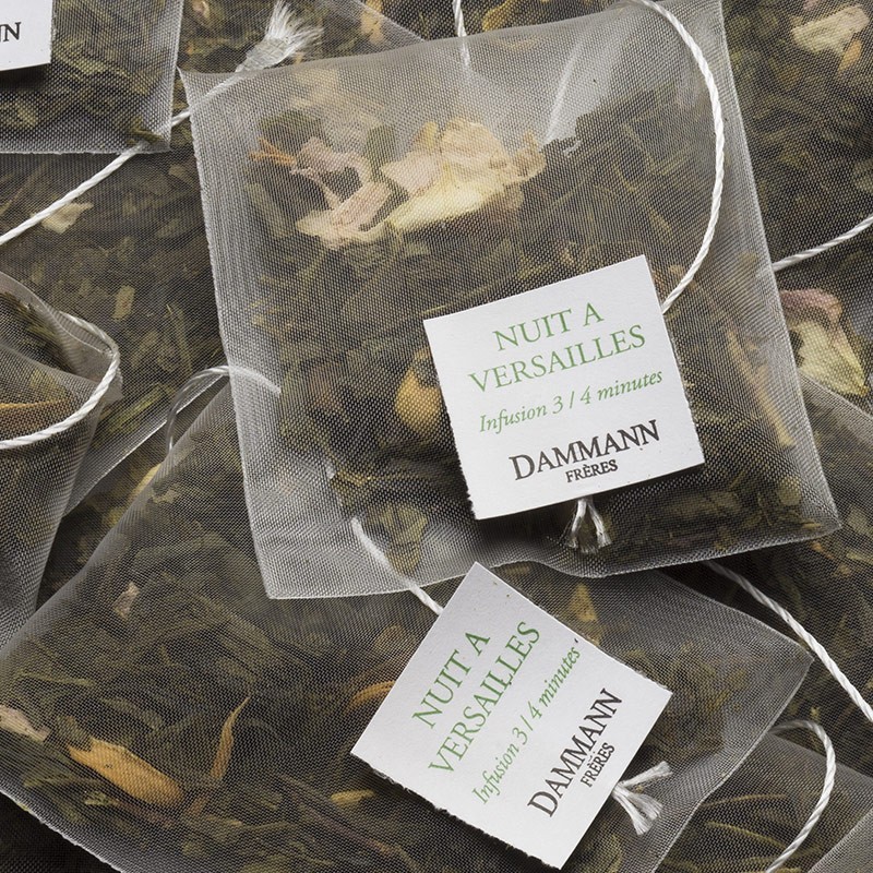 Il tè verde Nuit à Versailles di Dammann Frères è contenuto in esclusive e pratiche bustine "Cristal" incartate singolarmente.