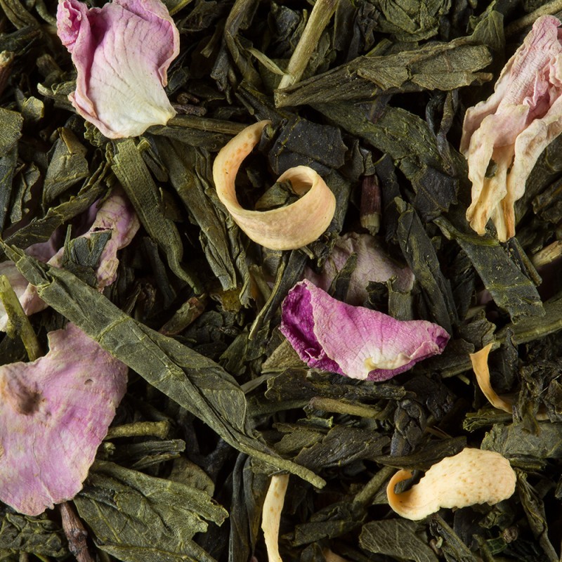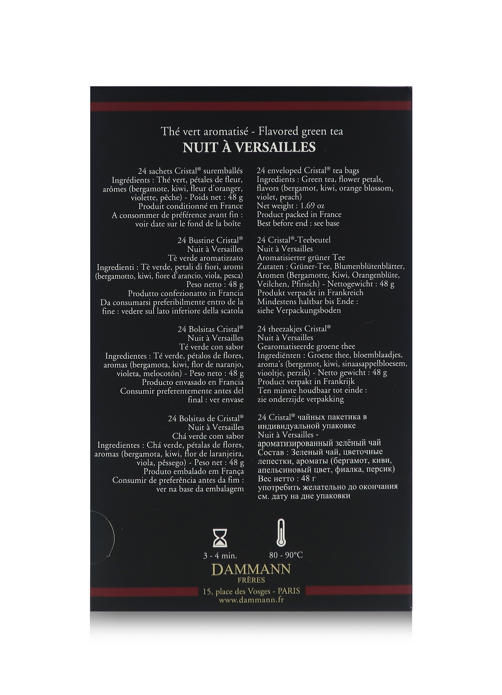 Il tè verde "Nuit à Versailles" celebra le note fruttate e floreali che abitano i lussureggianti giardini della reggia di Versailles: aromi di bergamotto, kiwi, pesca gialla, fiori d'arancio e di viola impreziosiscono una base di tè verde Sencha della Cina, dando vita a una miscela dal sapore nobile.