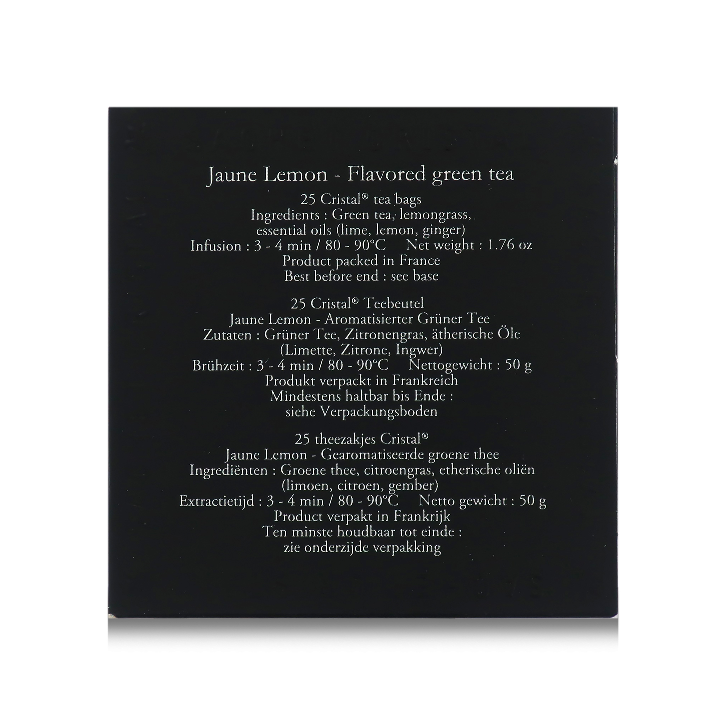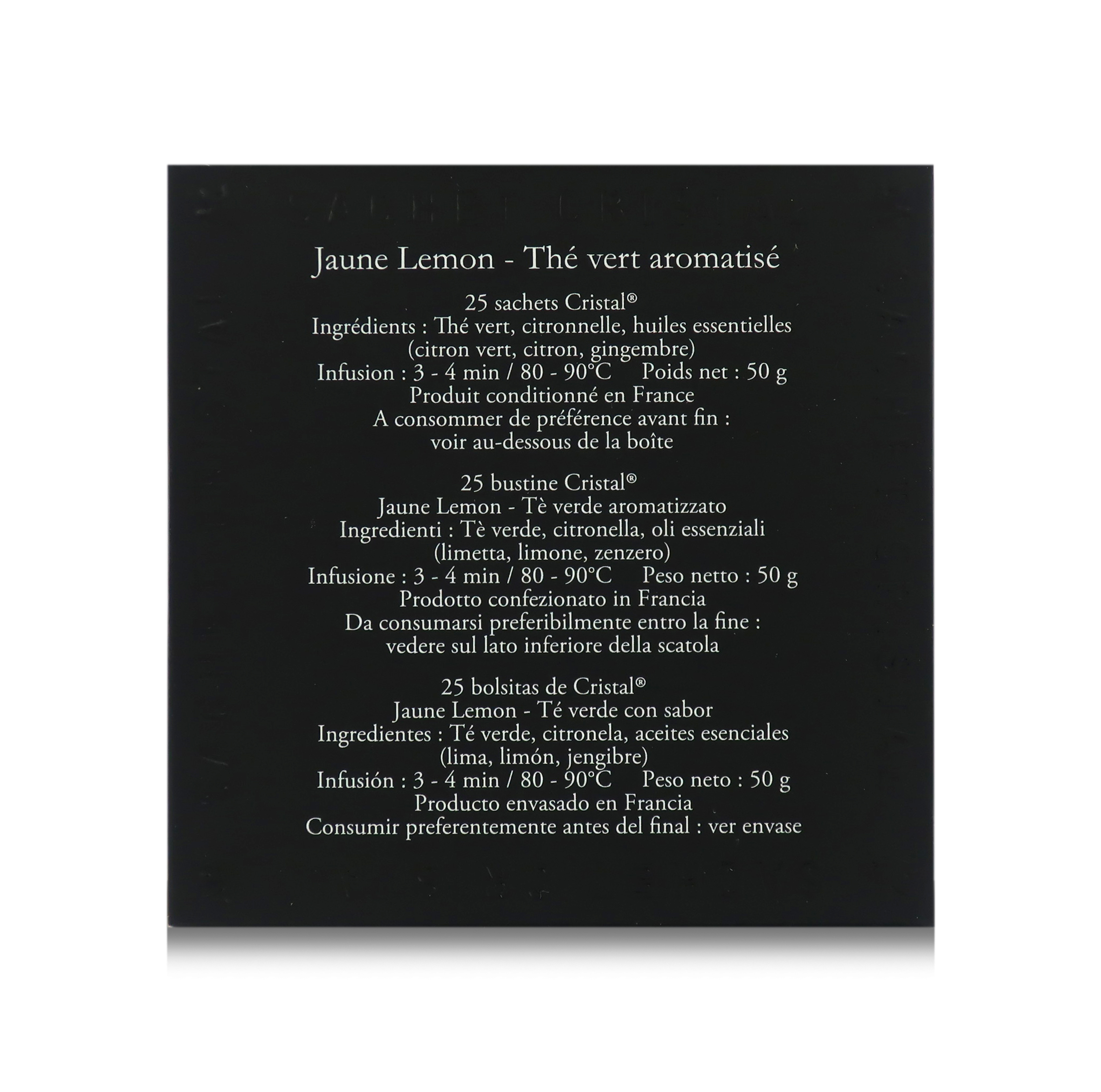 Lo Jaune Lemon vanta una combinazione originale e unica di tè verde Sencha cinese, citronella, oli essenziali di lime e di limone dolce, a cui si accompagna anche dello zenzero. Un tè decisamente agrumato e brioso, ma dal sapore armonico e fresco.