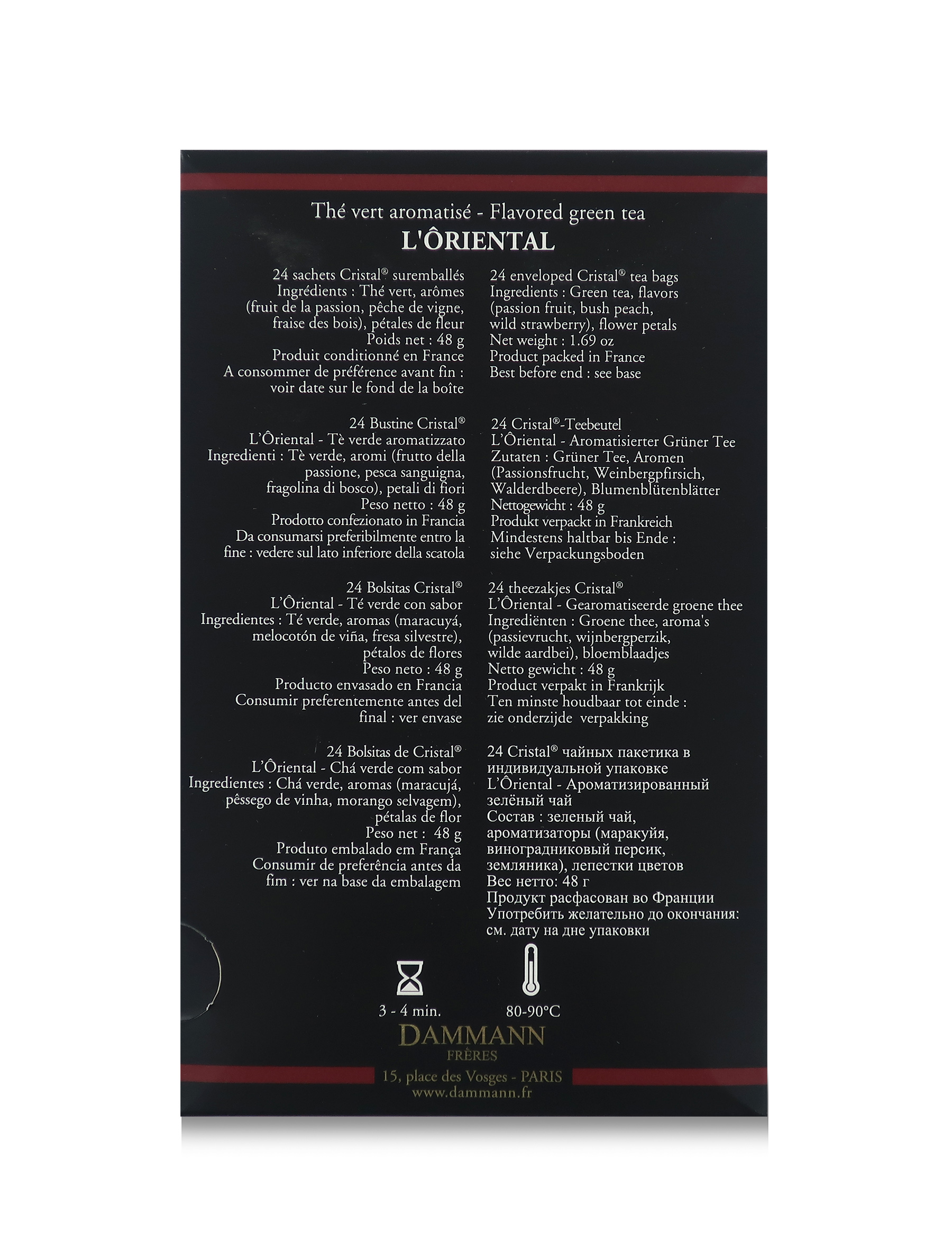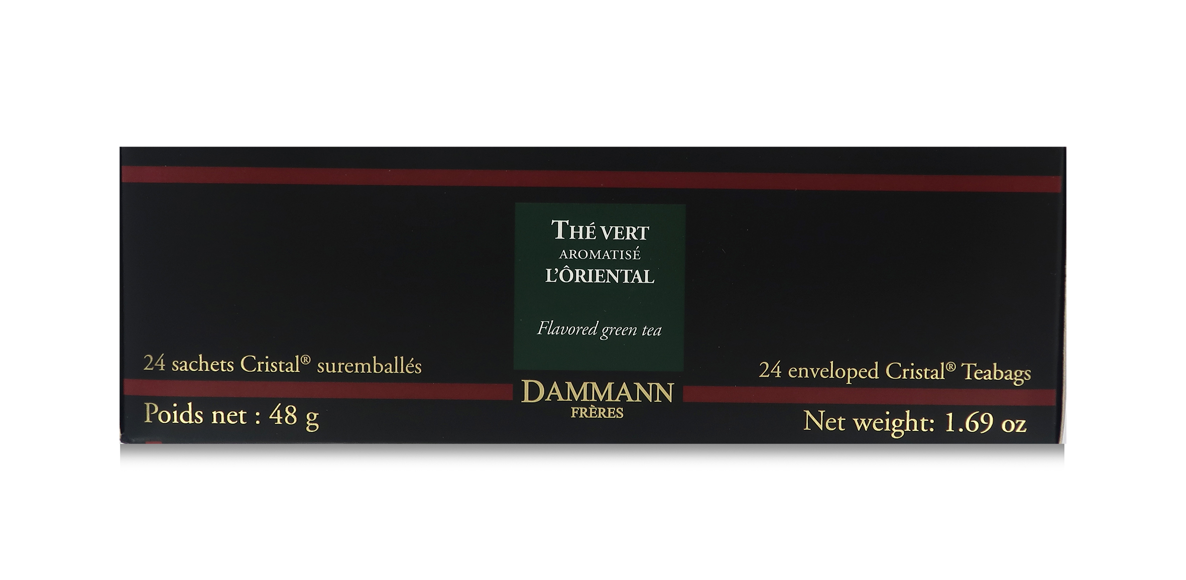 Il tè verde L'Ôriental dall'aroma esotico di Dammann Frères è contenuto in esclusive e pratiche bustine "Cristal" incartate singolarmente.