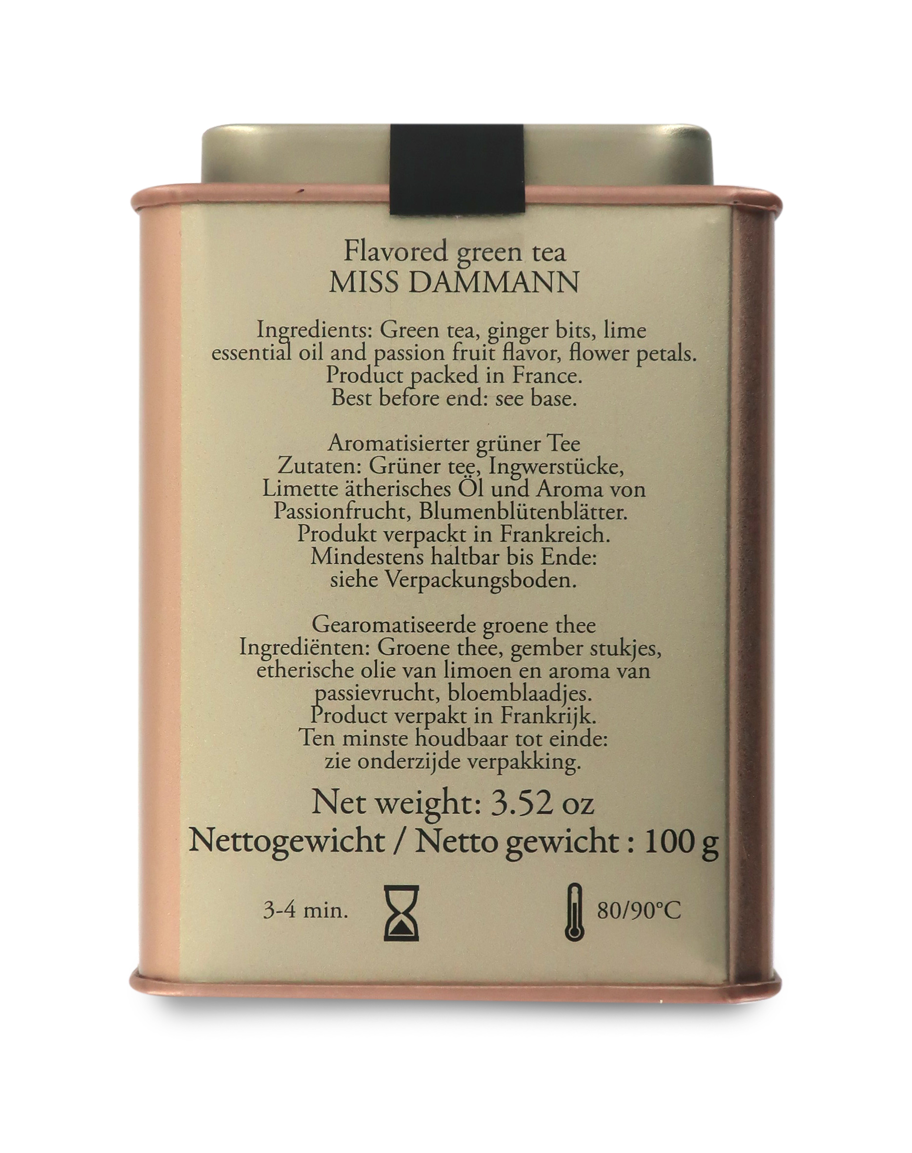 Il tè verde "Miss Dammann" di Dammann Frères è contenuto in un'elegantissima scatola di latta, perfetta non solo per conservare il prezioso aroma di questo tè pregiato, ma anche da regalare.