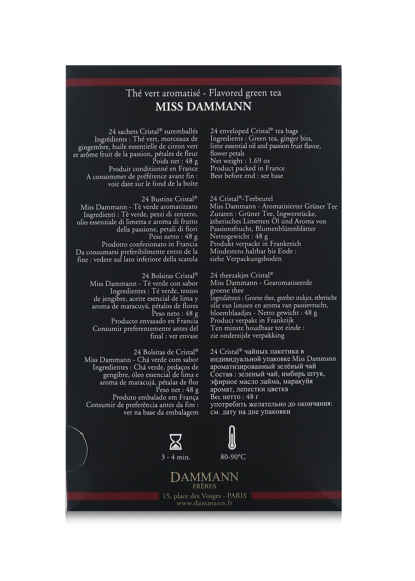 Il tè verde Miss Dammann risulta vivace e stuzzicante come una ragazza parigina. La sua miscela fresca e briosa nasce dall'unione di tè verde con zenzero, con il sapore agrumato del limone e con la nota fruttata del passion fruit.