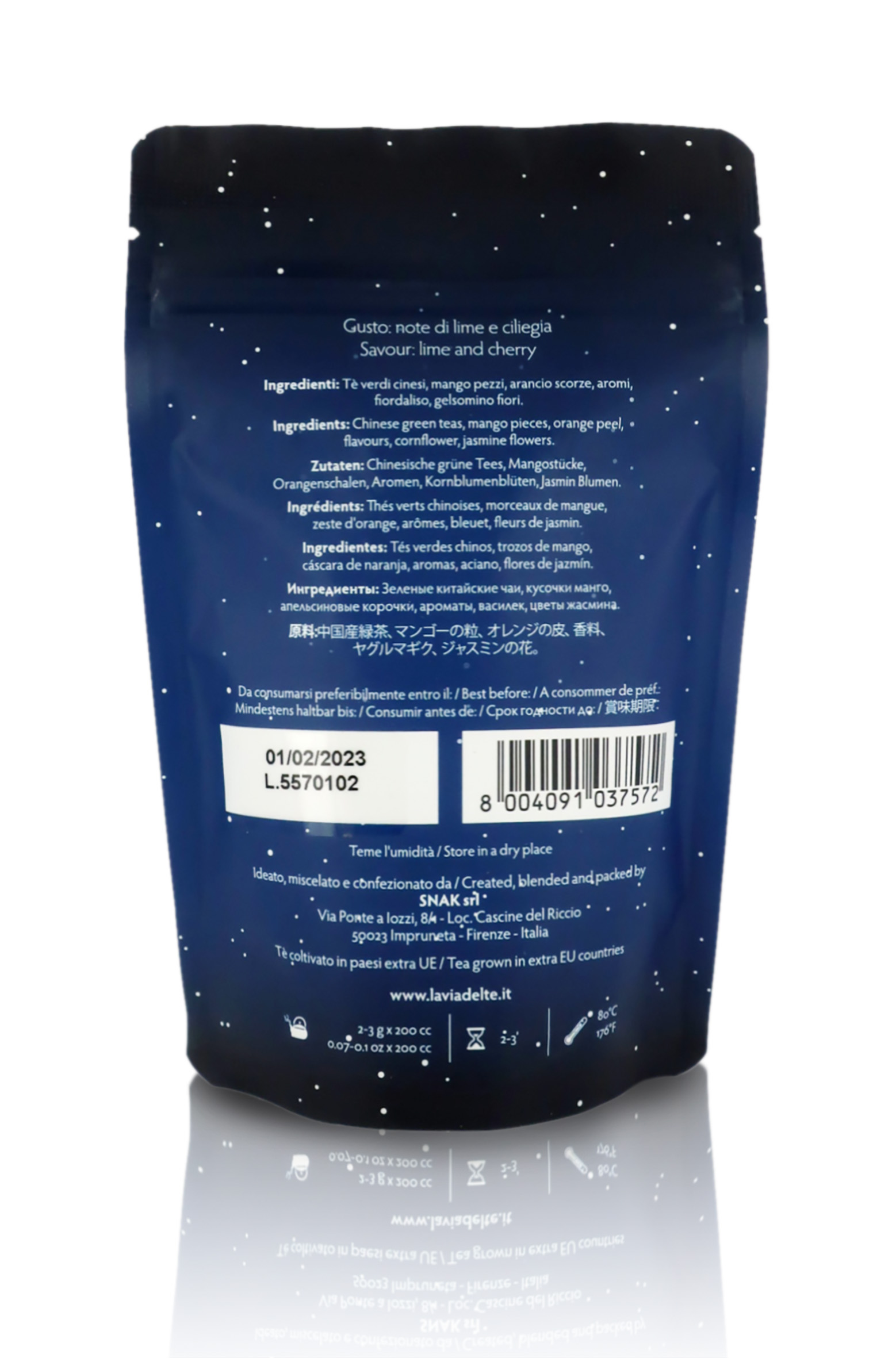 Ingredienti: Tè verdi cinesi, mango in pezzi, arancio in scorze, aromi, fiordaliso, fiori di gelsomino.