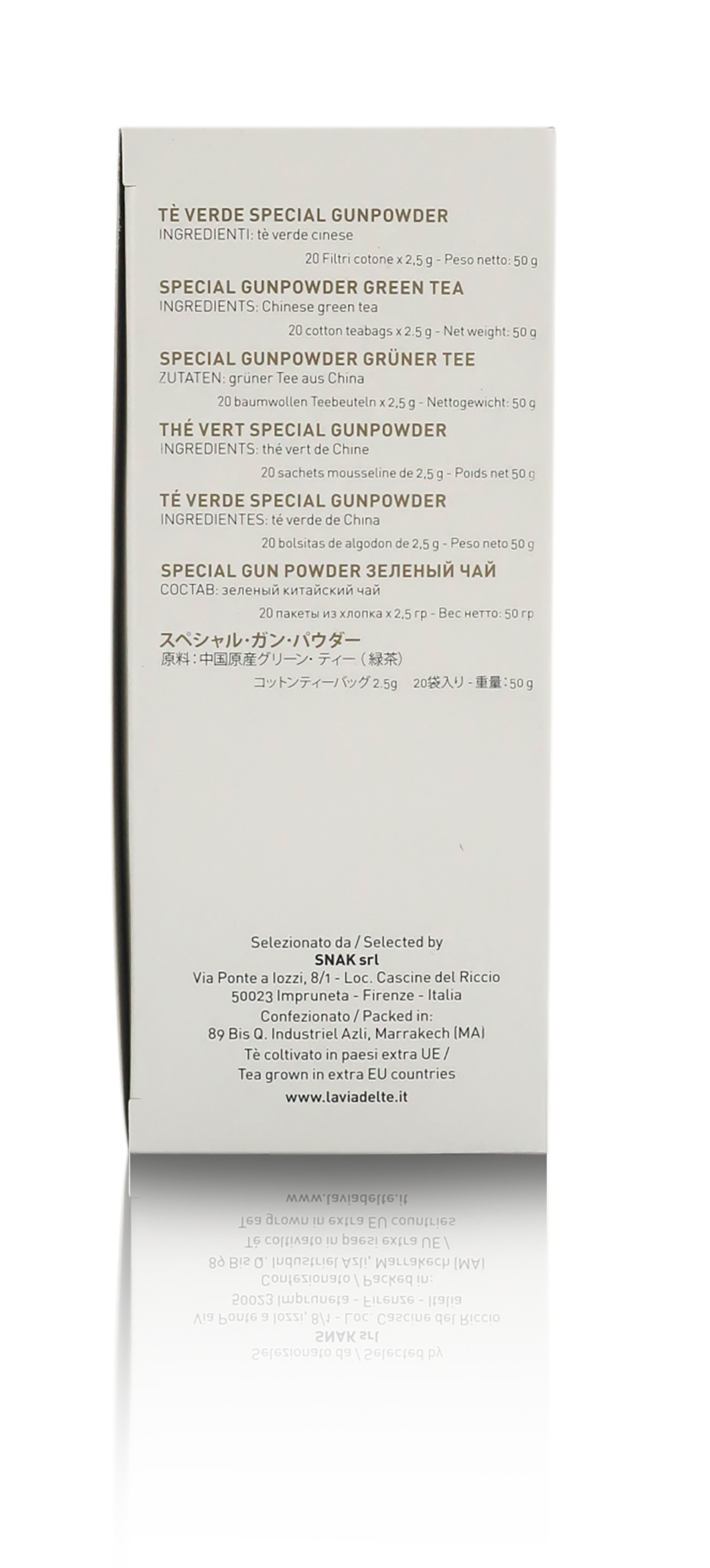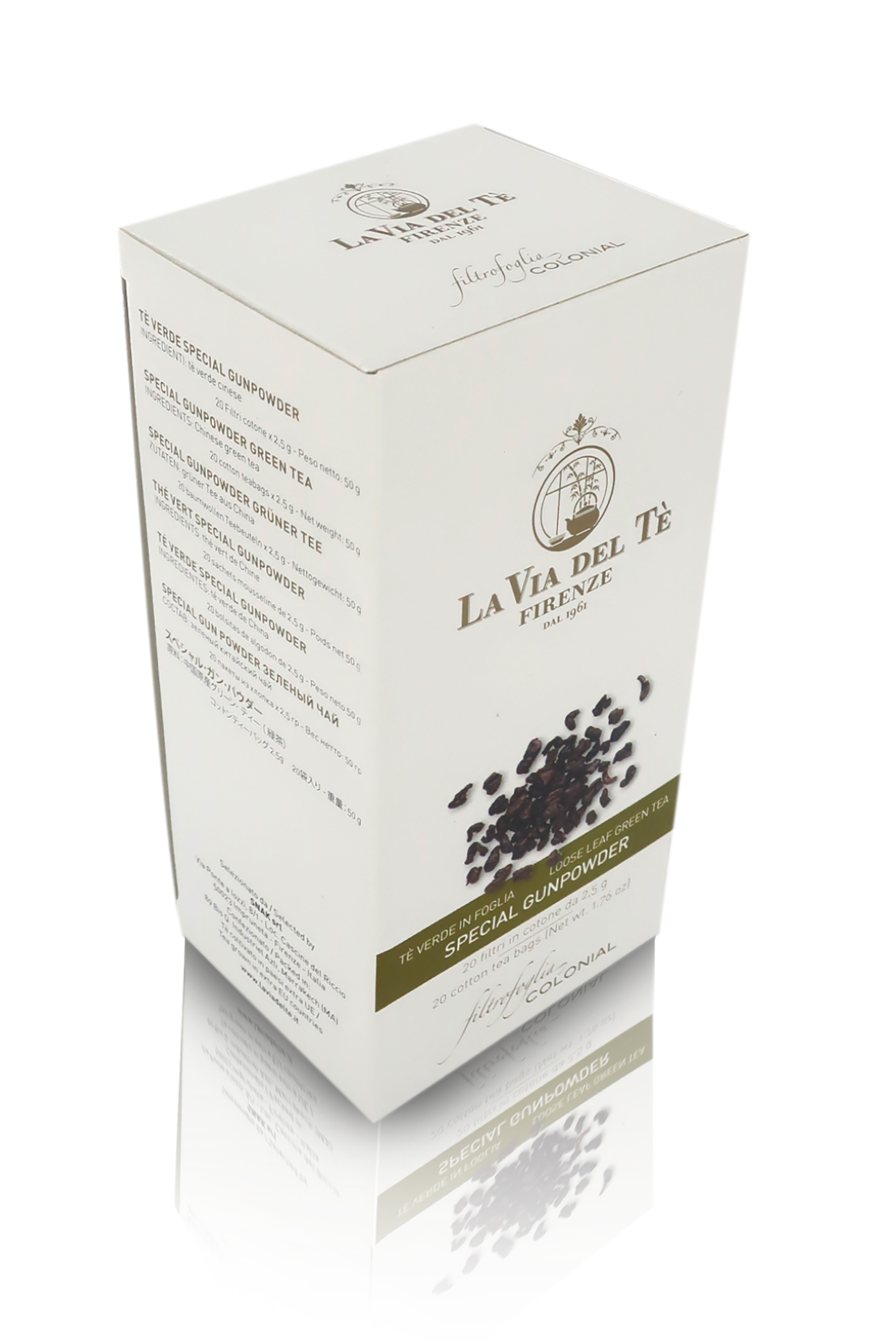 Tè verde Gunpowder dal sapore deciso, pieno e amarognolo. In astuccio da 20 filtri. Si distingue per aromi e profumi erbacei. Colore: giallo intenso.