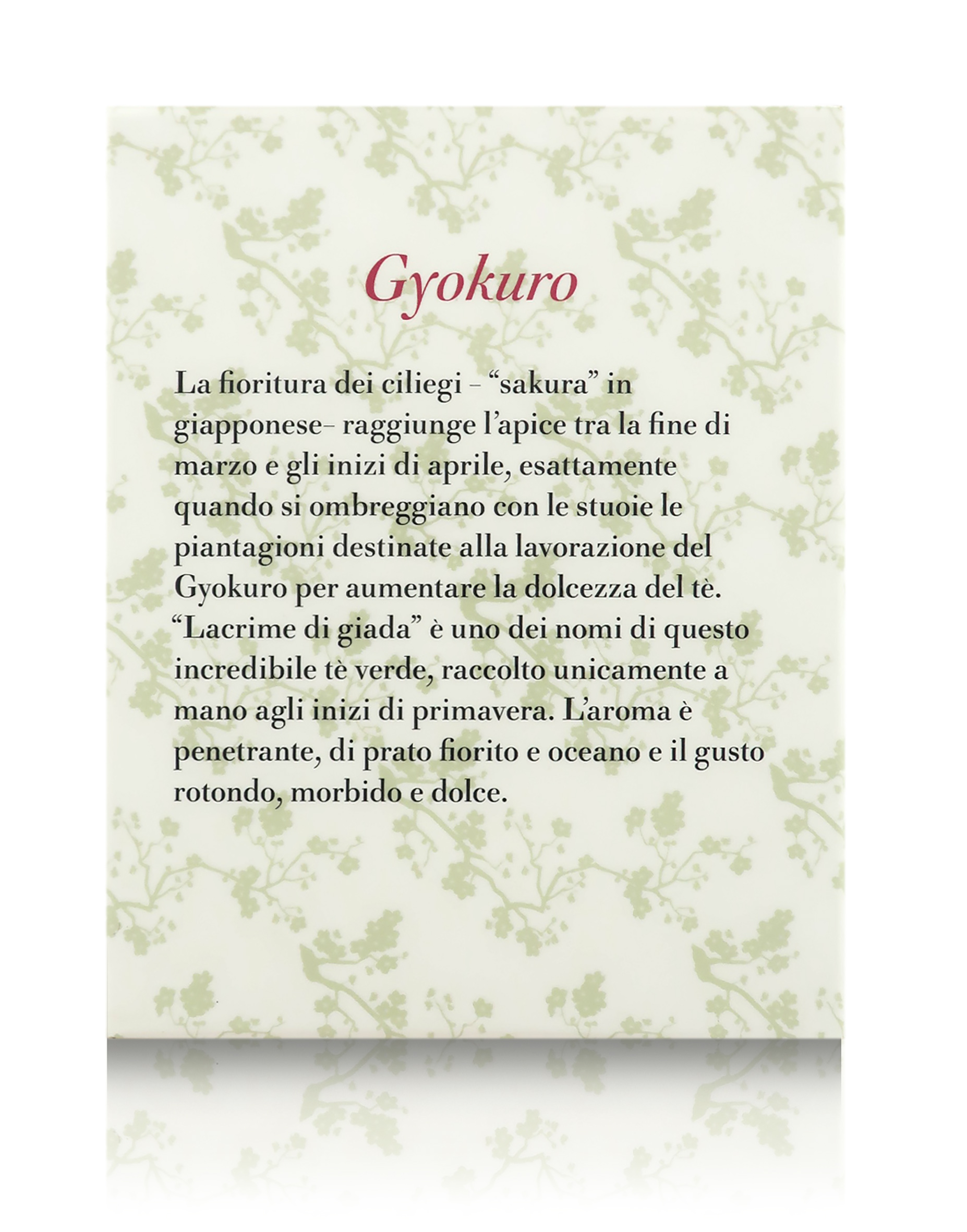 Per rendere questo tè verde giapponese "Gyokuro" ancora più dolce, le piantagioni vengono ombreggiate con stuoie nel periodo in cui i ciliegi fioriscono a cavallo tra marzo e aprile. È una qualità di tè raccolta a mano all'inizio della primavera. Vanta un aroma floreale intenso e dolce. In tazza, la bevanda assume una colorazione verde chiara.