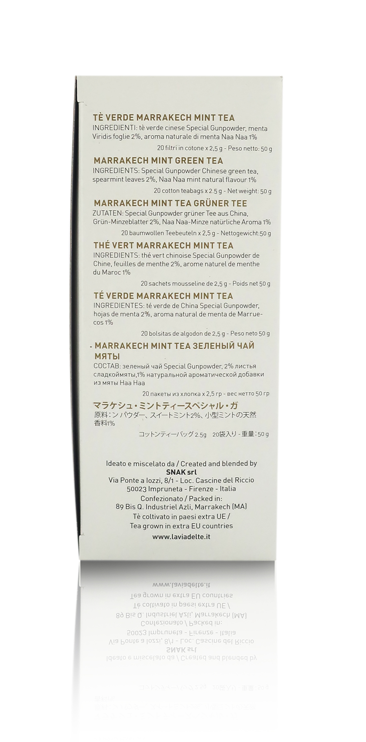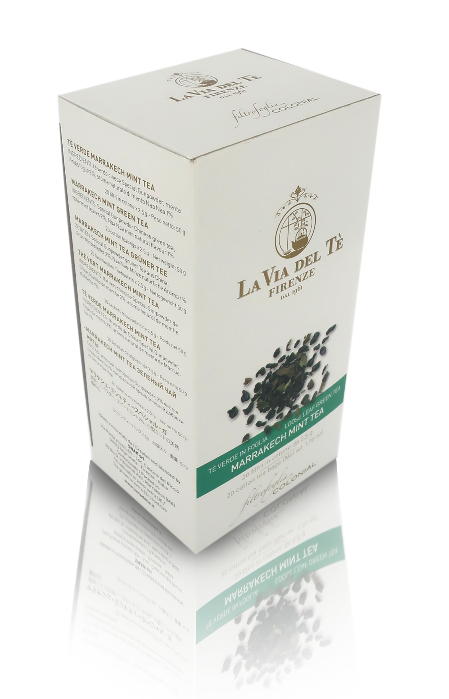 Miscela tradizionale realizzata con tè verde e foglie di menta. Il pregio del tè Gunpowder si unisce alla freschezza delle foglie di menta Viridis e all'estratto naturale dell'intensa menta Nana). Si distingue per il profumo dolce e inconfondibile della menta marocchina. Ottimo da bere anche freddo. In astuccio da 20 filtri.
