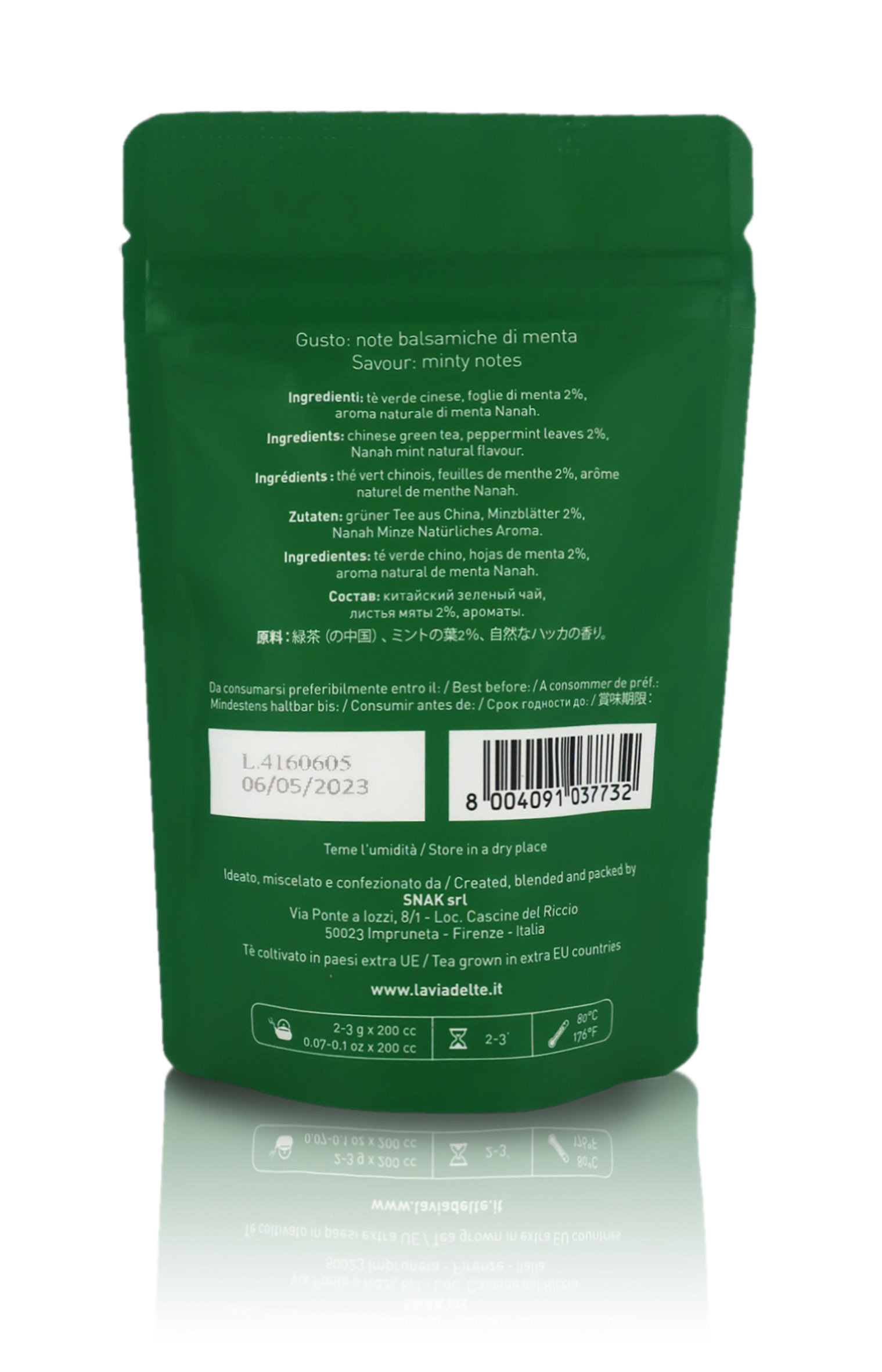 Ingredienti: tè verde cinese Special Gunpowder, menta Viridis in foglie 2%, aroma naturale di menta Nana 1%.