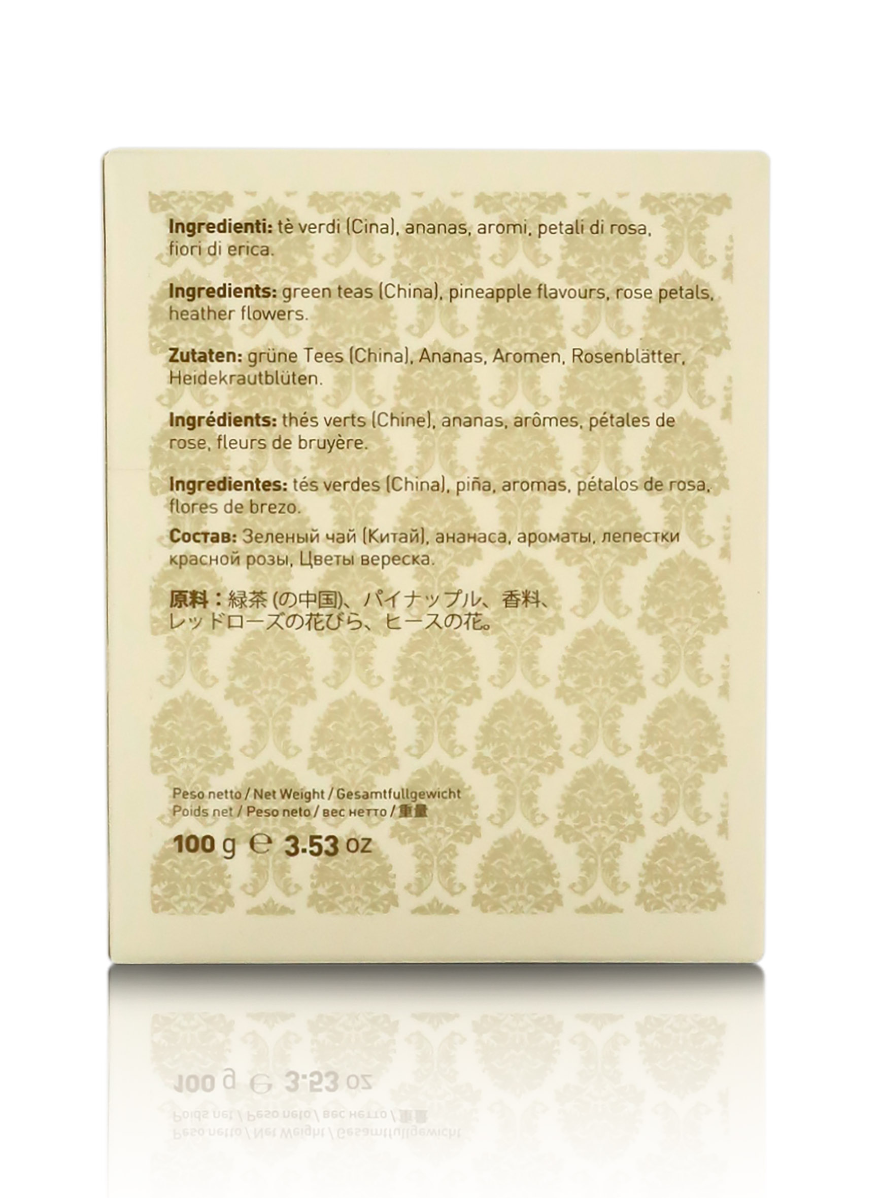 Ingredienti: tè verdi, ananas, aromi, petali di rosa, fiori di erica.