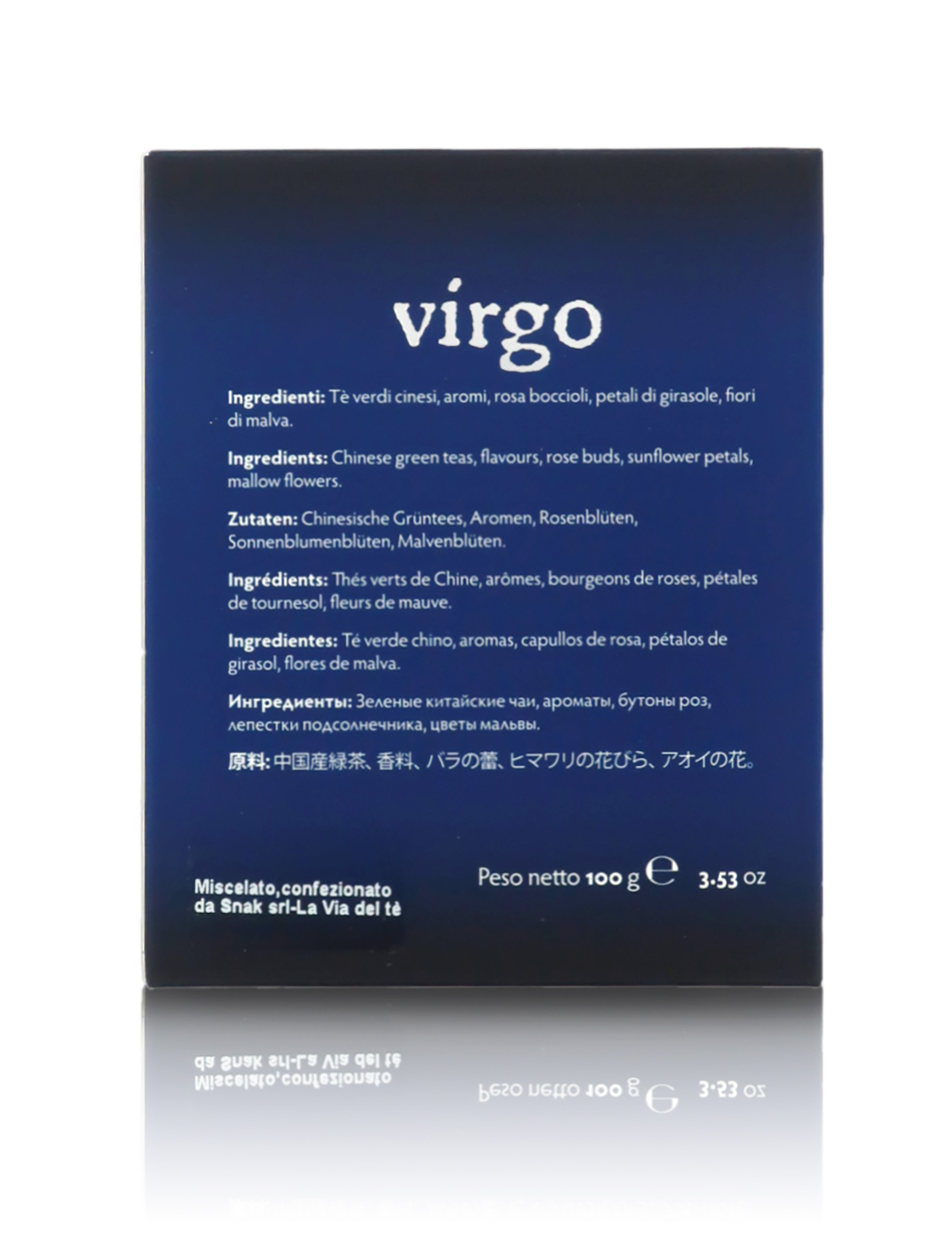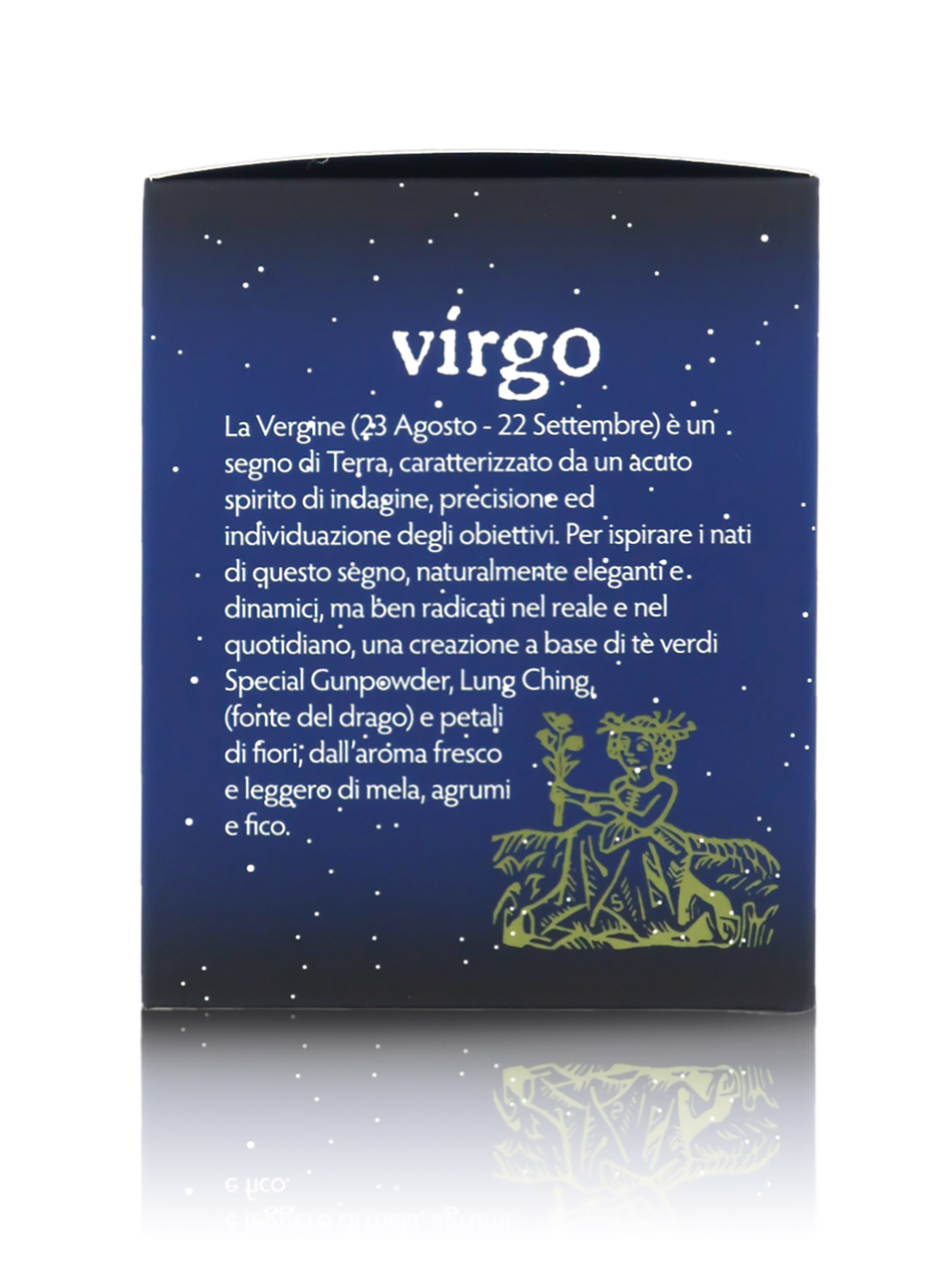 Miscela sfusa di tè verdi cinesi, piacevolmente profumata, dedicata al segno della Vergine. Segno di terra (come il Toro e il Capricorno). I nati sotto il segno della Vergine (23 Agosto - 22 Settembre) si distinguono per precisione, dinamicità e pragmatismo.