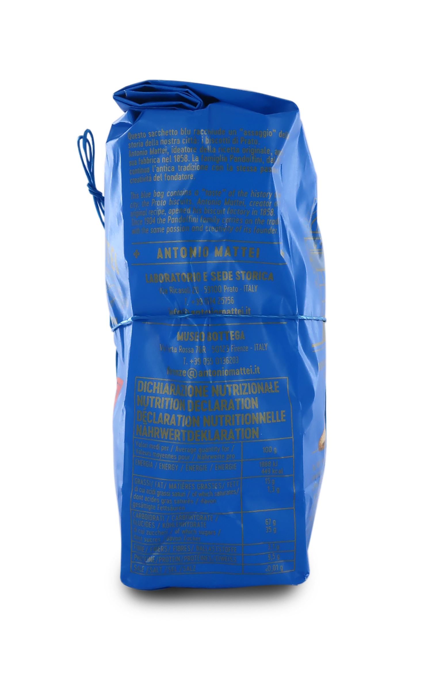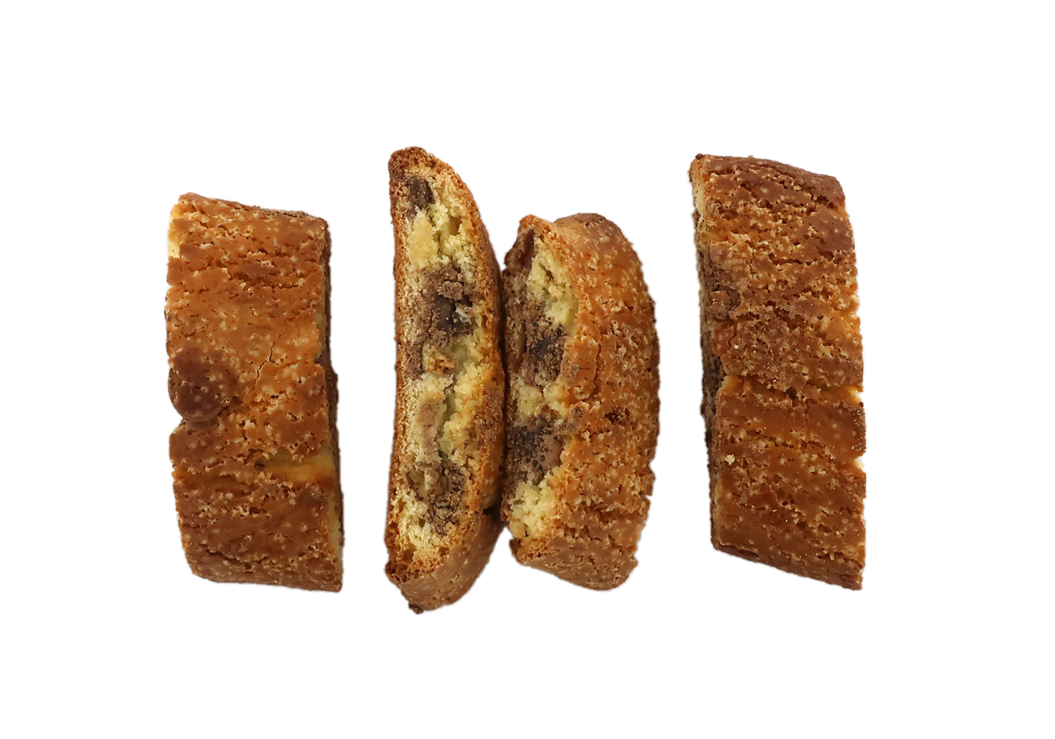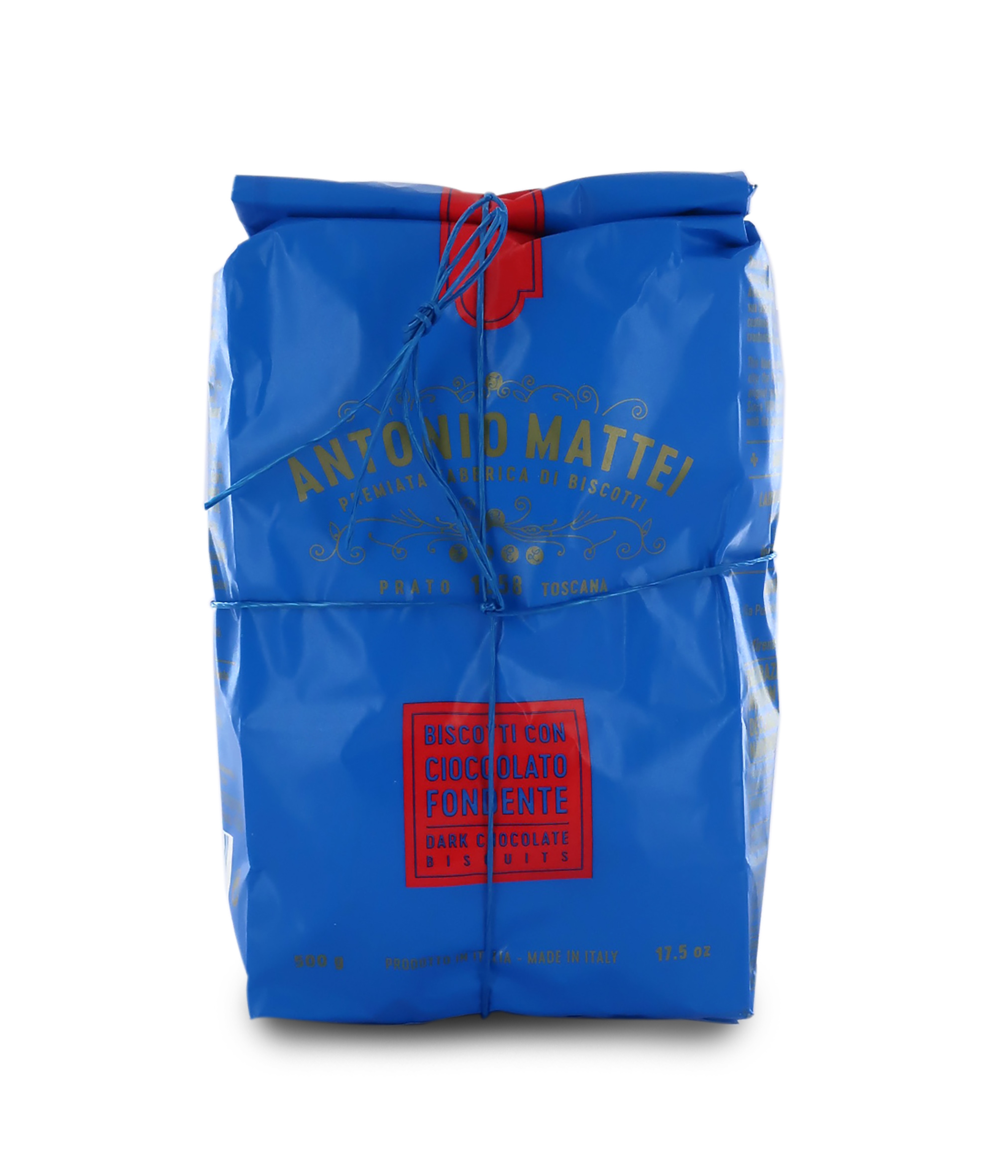 Mattei rivisita il cantuccio in questa versione sfiziosa, sostituendo le classiche mandorle con gocce di cioccolato fondente. Per la sua preparazione, viene impiegato un cioccolato fondente di qualità, che rende questi cantucci ancora più gustosi.