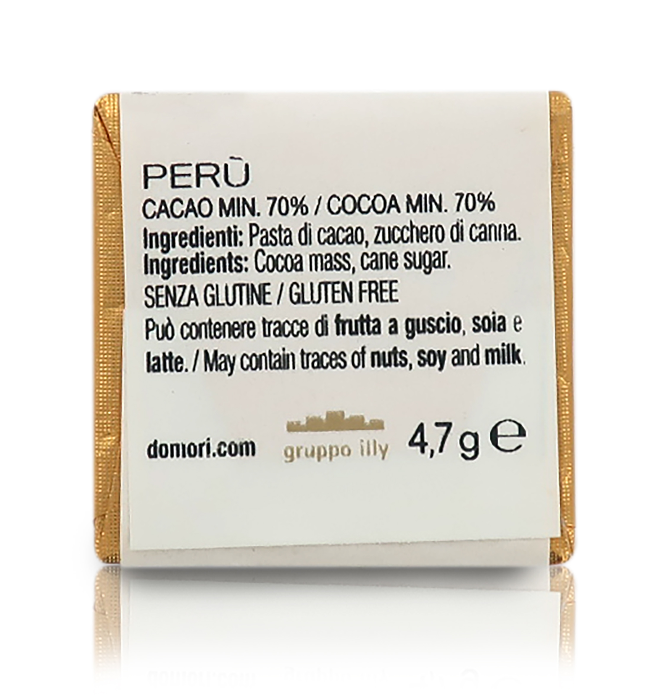 Cioccolatini Napolitain realizzati con 70% di cacao Trinitario Apurimac proveniente da piccoli produttori locali del Perù. Confezione da 1 chilogrammo, contenente circa 185 cioccolatini Napolitain.