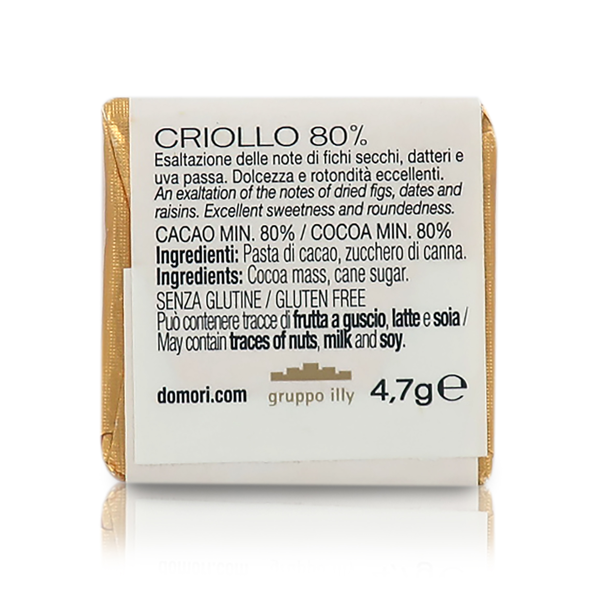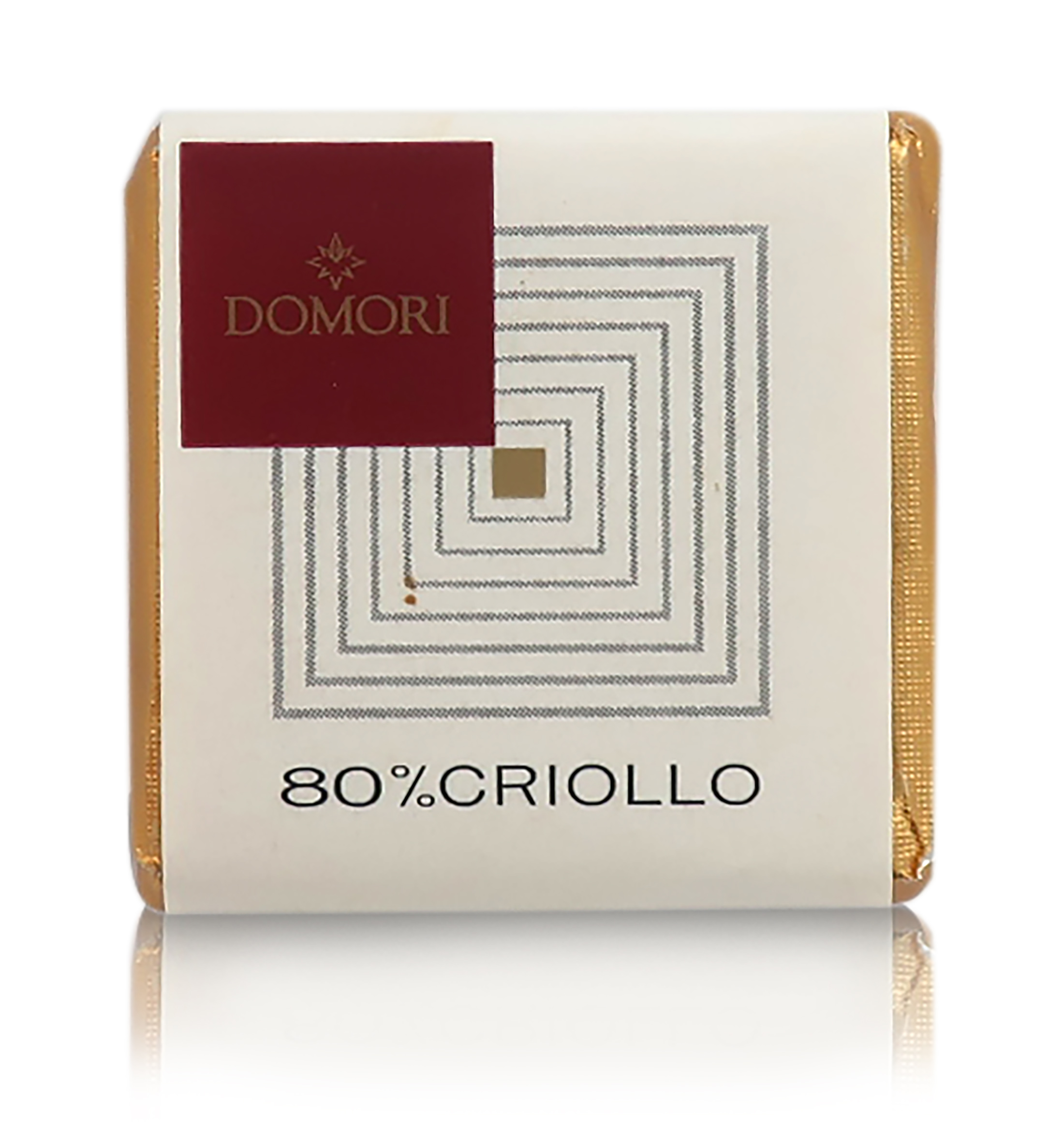 Varietà di cacao rara e fragile, il Criollo blend 80% di Domori ha ricevuto la medaglia d'oro come miglior fondente dall'Academy of Chocolate Awards. Ogni singolo Napolitain misura 3,3 x 3,3 cm e pesa 4,7g.