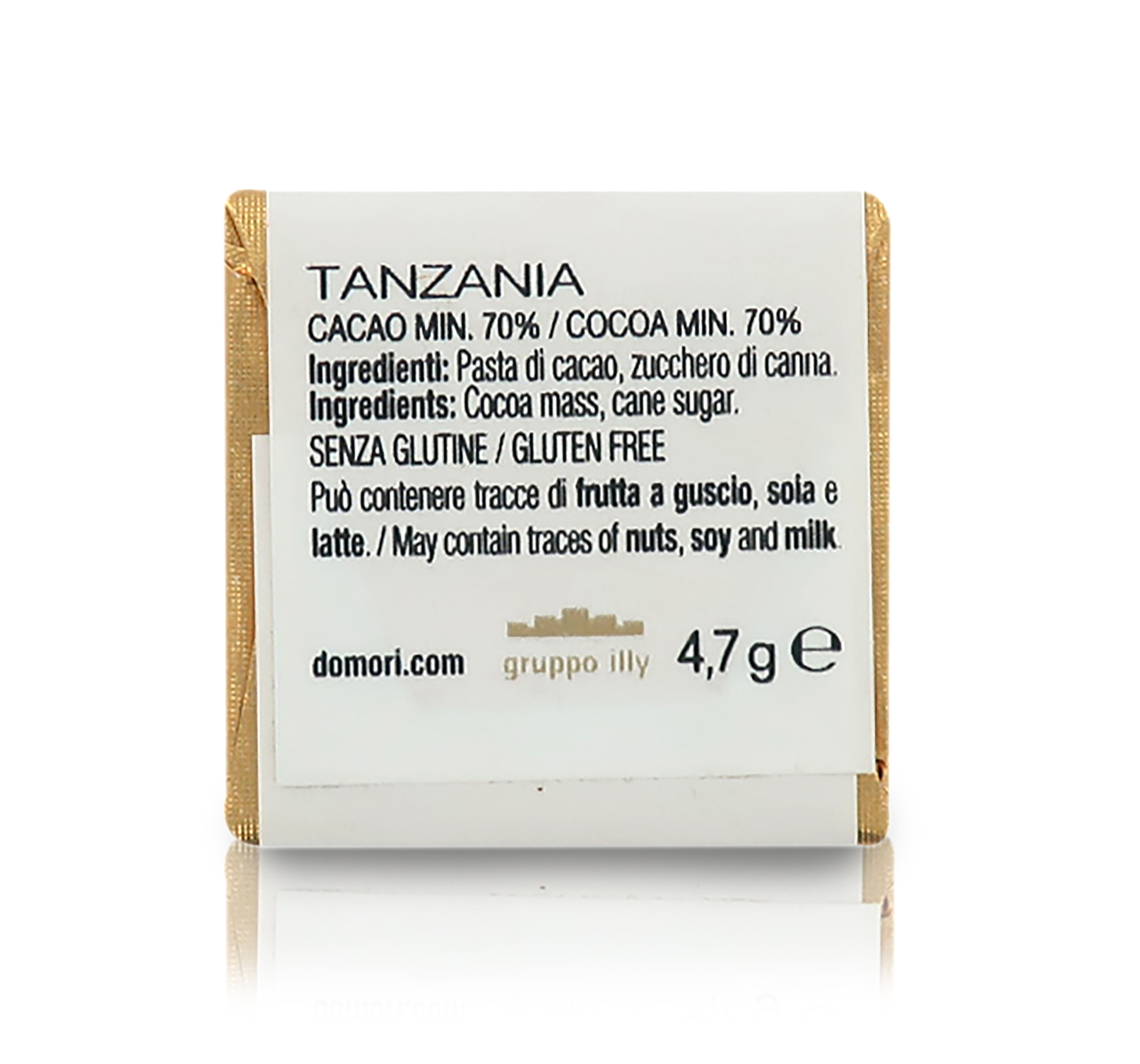 Ingredienti: pasta di cacao origine Tanzania, zucchero di canna. Può contenere tracce di latte, SOIA e FRUTTA A GUSCIO.