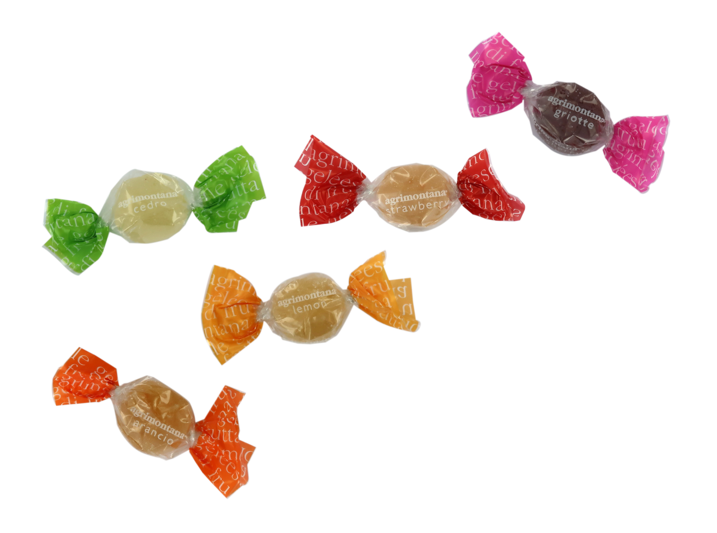 Le gelées di frutta Agrimontana sono prodotte esclusivamente con frutta di prima scelta, secondo procedimenti che esaltano i sapori e i profumi di ciascuna essenza di frutta. Coloranti, conservanti e aromatizzanti non vengono impiegati nella realizzazione di queste caramelle. La selezione della materia prima all'origine e la scelta del momento di maturazione della frutta permettono di mantenere in modo naturale sapori e colori della frutta fresca. Le gelées agli agrumi (arancia, cedro e limone) sono realizzate con pasta di frutta prodotta con gli agrumi canditi da Agrimontana.
