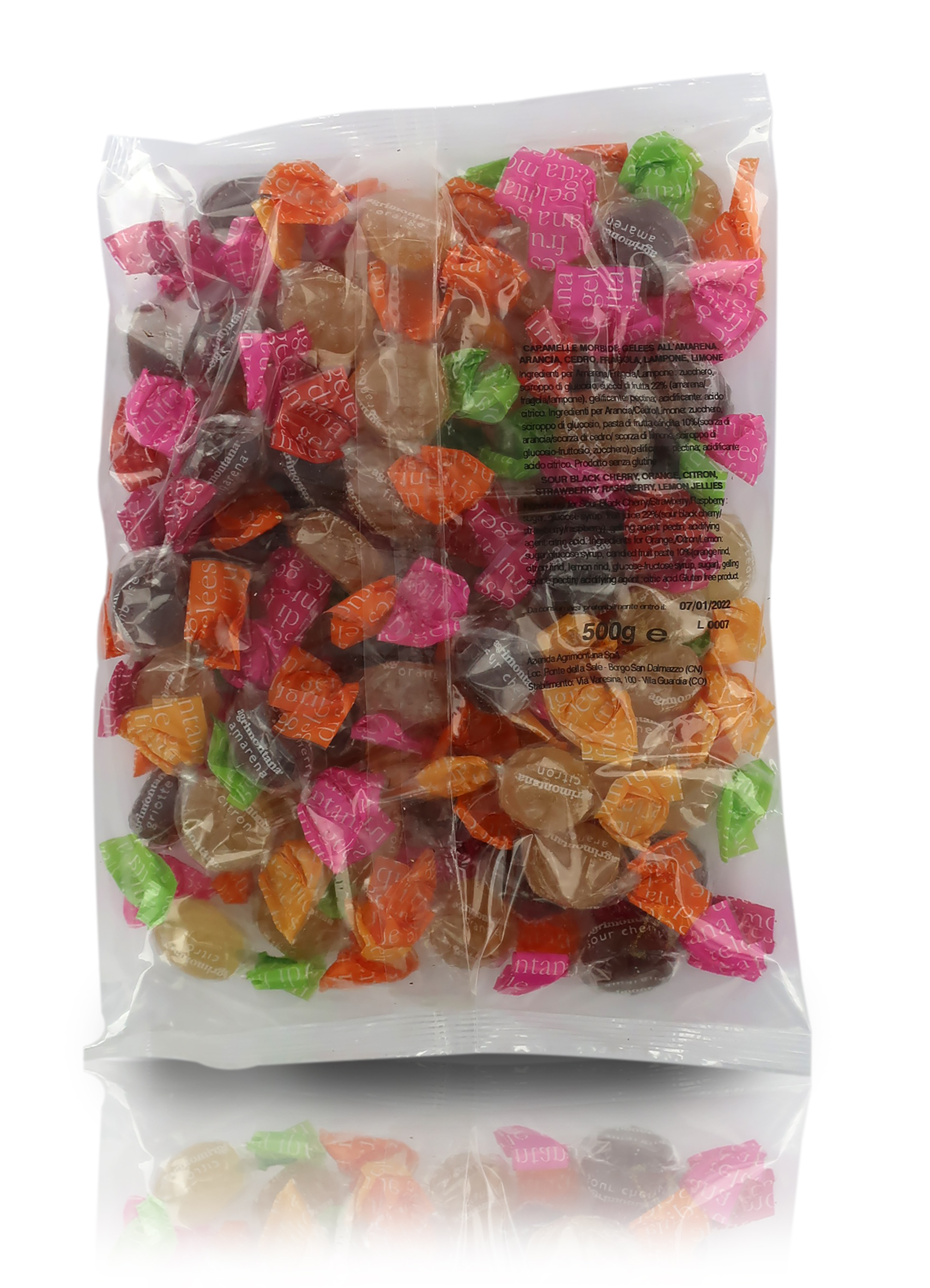 Sacchetto da 500g di caramelle gelatinose alla frutta, gusti assortiti (amarena, fragola, lampone, limone, arancia e cedro), incartate singolarmente. Prive d'ingredienti di origine animale (latte, grassi e gelatina). Senza glutine e soia.