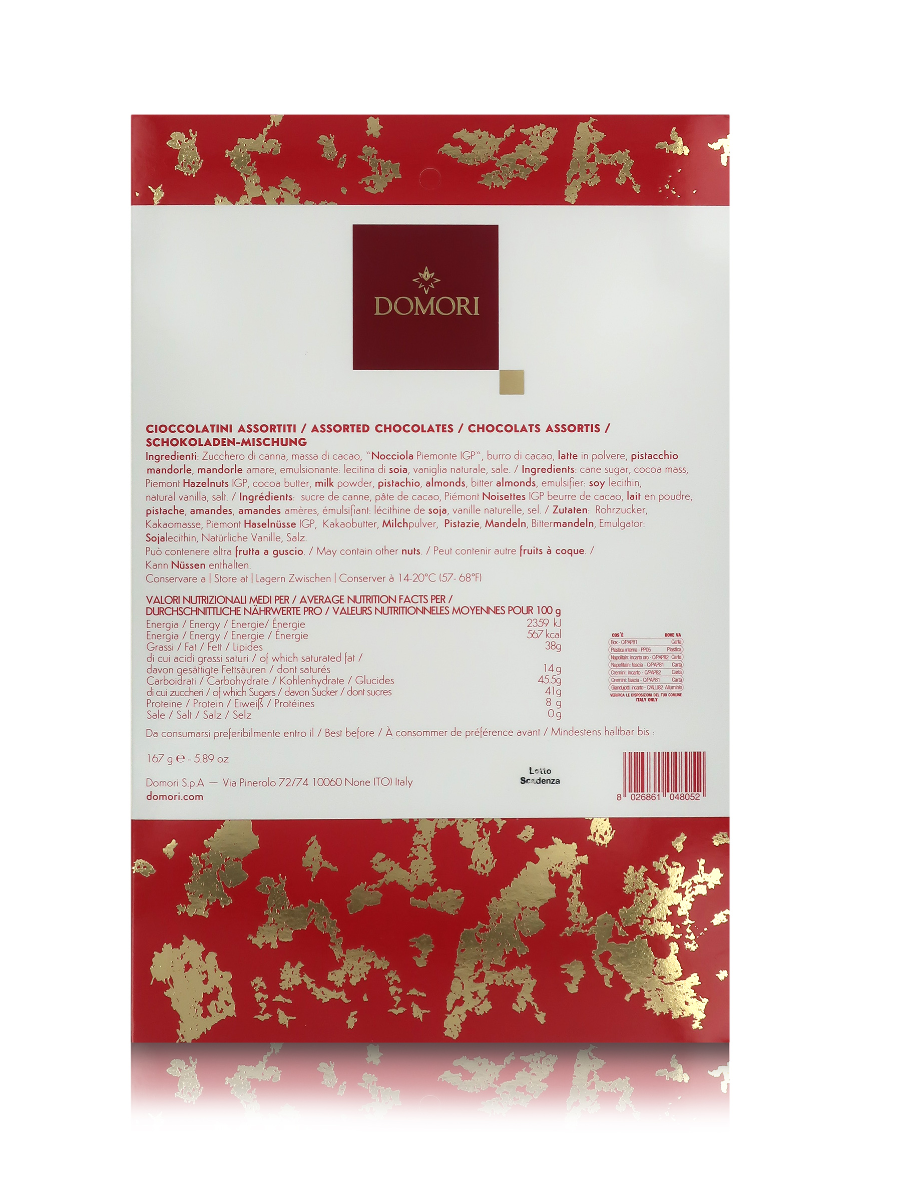 Ingredienti: Zucchero di canna, massa di cacao, “NOCCIOLA Piemonte IGP”, burro di cacao, LATTE in polvere, PISTACCHIO, MANDORLE, MANDORLE amare, emulsionante: lecitina di SOIA, vaniglia naturale, sale. Può contenere altra FRUTTA A GUSCIO.