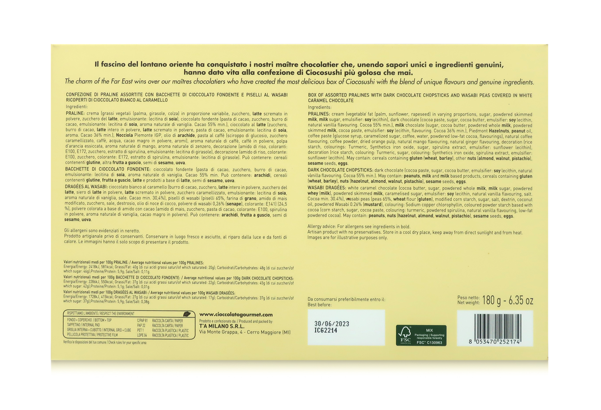 20 praline artigianali a forma di sushi, realizzati dai maître chocolatier di T'a Milano. Queste originalissime praline sono realizzate con cioccolato fondente (ripieno allo zenzero e al caffè) e con cioccolato al latte (ripieno al mango e alla nocciola). La scatola include anche bacchette in cioccolato fondente e dragées al wasabi. Innovativo, delizioso e affascinante, CG Chocosushi è molto più di un semplice dessert; è un'esperienza culinaria che unisce il meglio di due mondi gastronomici in un'unica creazione straordinaria. Con CG Chocosushi, gustare il cioccolato diventa un viaggio sorprendente e appagante che soddisfa sia i sensi che il desiderio di qualcosa di straordinario. Peso netto: 180g. Ingredienti pubblicati sulla scatola. Come indicato nei termini di vendita, ingredienti, valori nutrizionali e allergeni potrebbero subire delle modifiche. Verificare sempre quanto riportato sul prodotto ricevuto. "CG" (Cioccolato Gourmet) è la firma della giovane cioccolateria milanese che crea orgogliosamente le proprie delizie nei territori della provincia della Madunina. È un marchio che incorpora la voglia d'innovazione, offrendo prodotti di altissimo livello che rientrano a pieno titolo in quel Made in Italy culinario che diventa eccellenza.